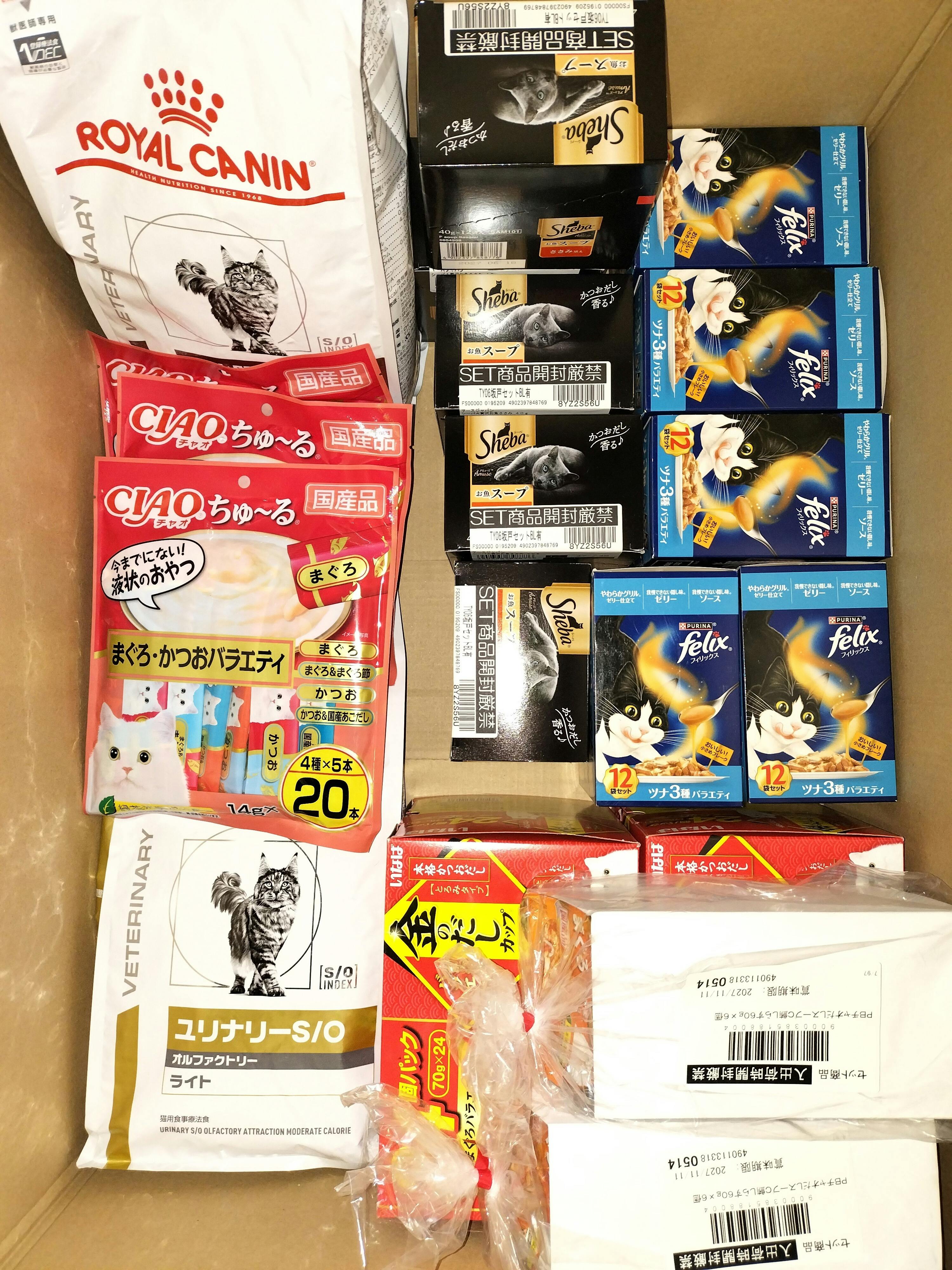 user_fa259b8aa6e4様、reomaruma様、fuchamekogechaa様、etsumo様、MF.グローバル様、user_aeed1fafc4e4様方からの豪華な支援物資です。保護猫達と野良猫達も皆様のお力添えで、美味しいご馳走が出来ました。チャッピーもお陰様で、一昨日病院で2回目の注射をしてきましたので、風邪もだいぶ治りました。食欲はあるんですが、まだ食べれませんが、シリンジで、ad缶を食べさせるのに、なかなか捕まらないのです… 逃げ足だけは早いのです…