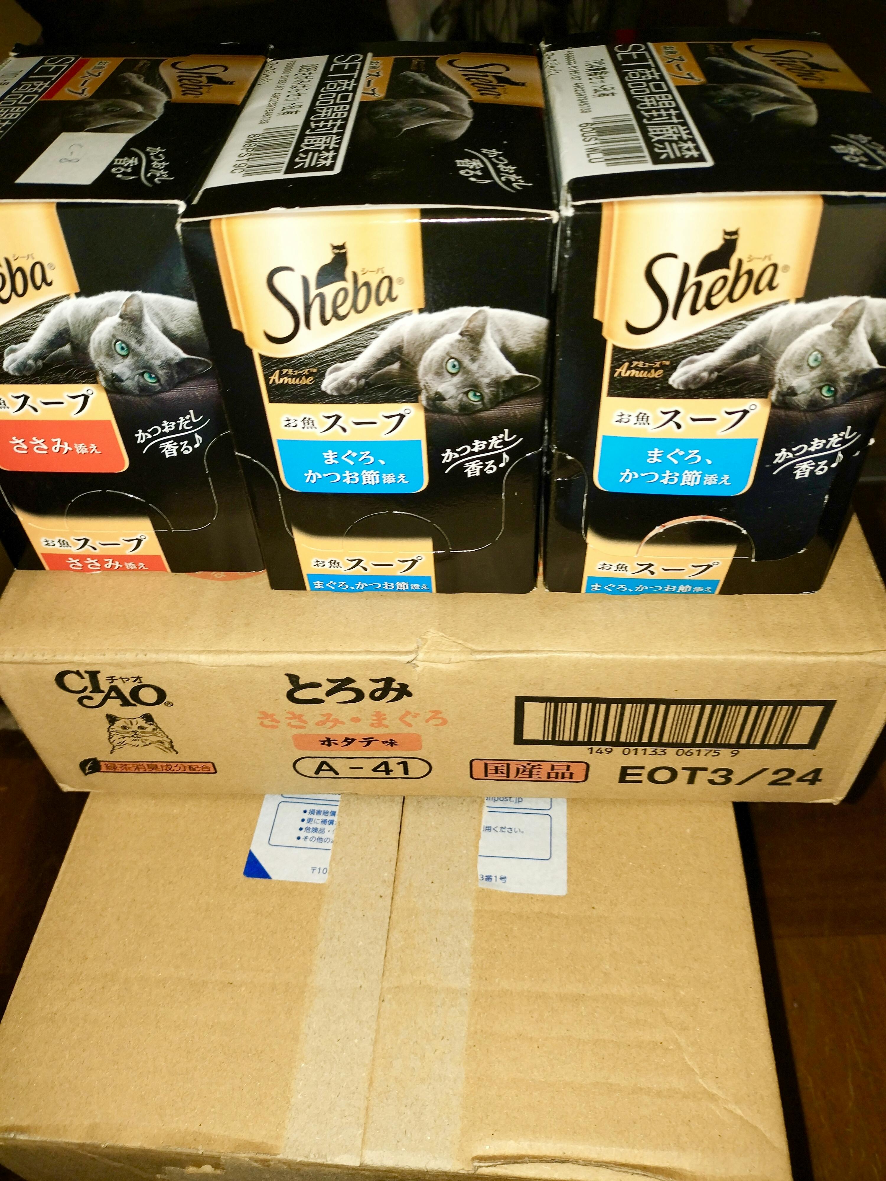 こんなに豪華なご馳走が届きまして、私には絶対に買えないのですが、支援者様方には感謝でいっぱいです。 猫達と共にお礼を申し上げます。ありがとうございます。
