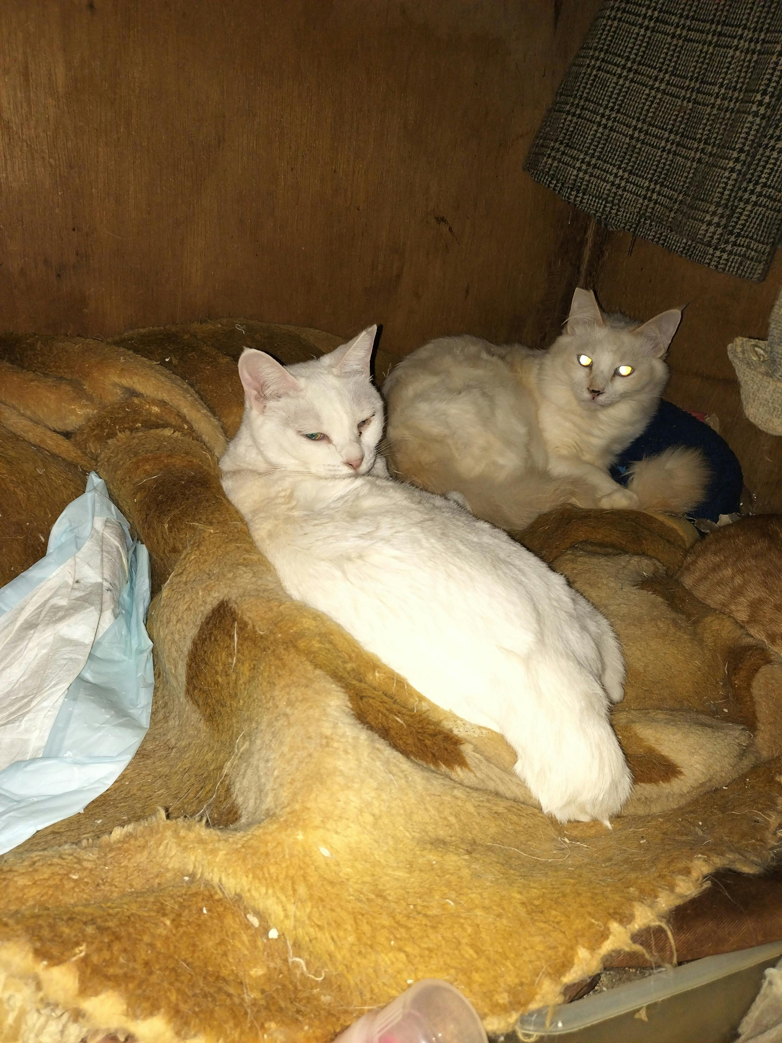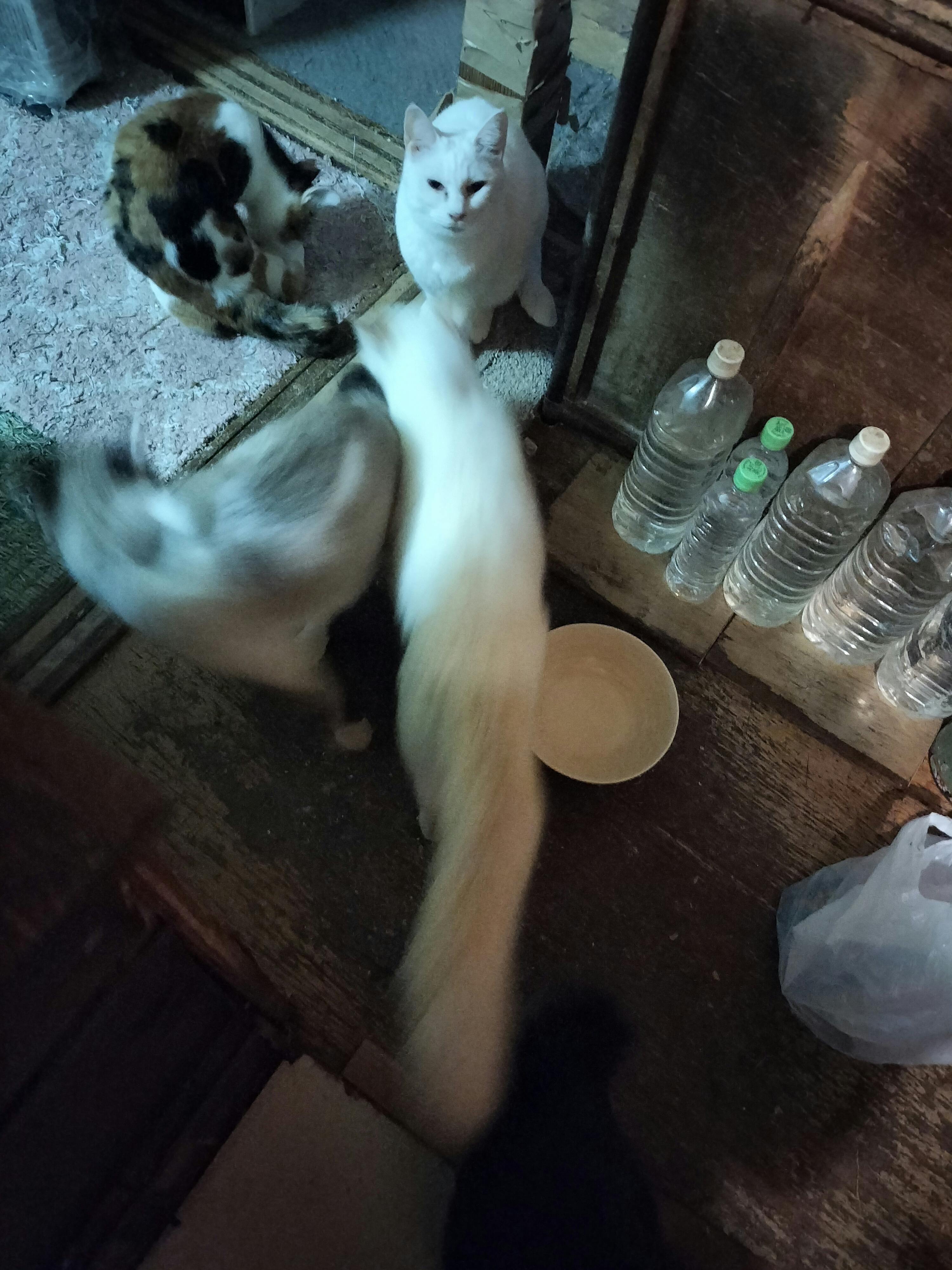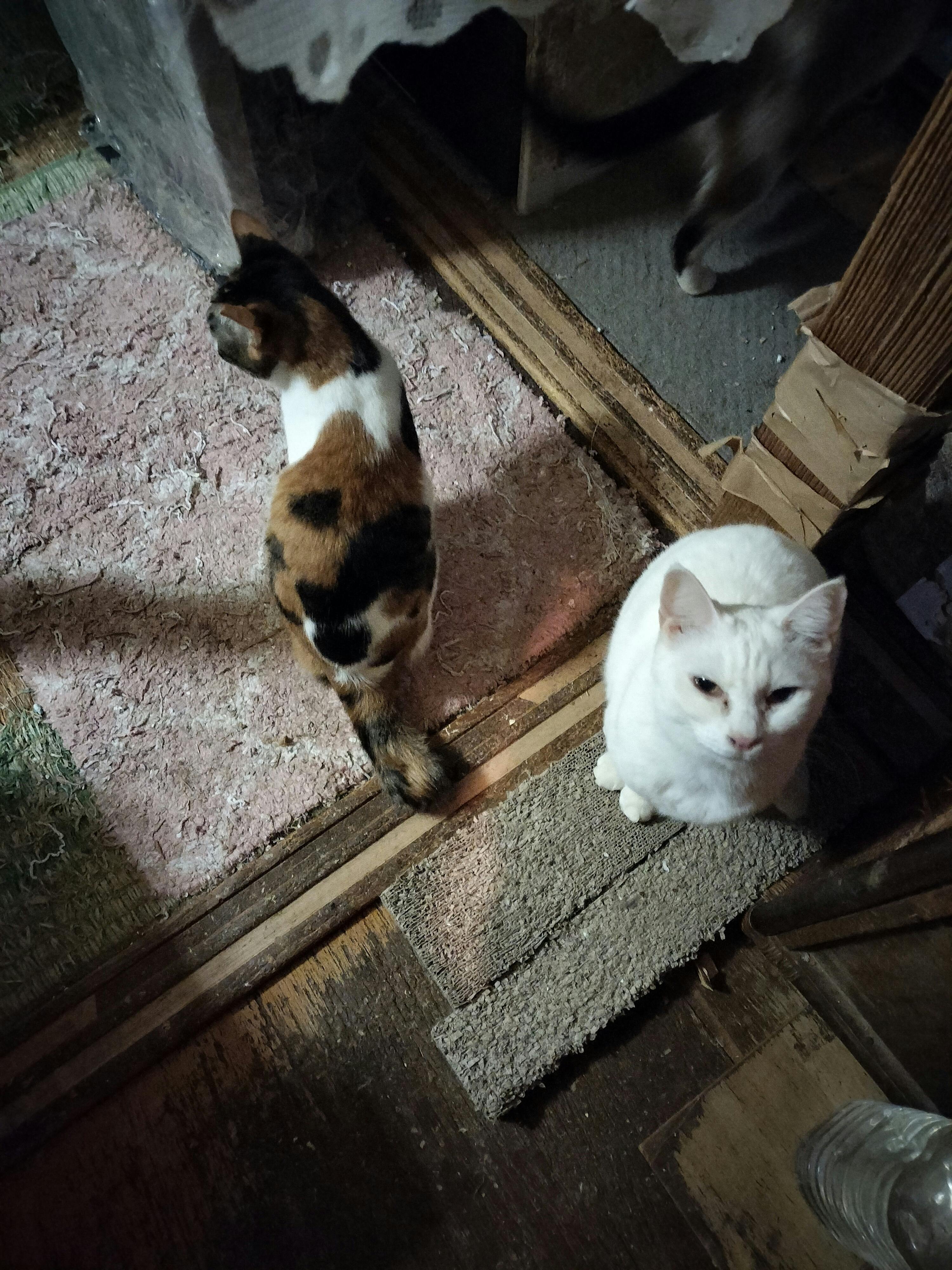 白猫達も今年で12歳だと聞きました。食欲がないとのことでしたので、カップの液体のご飯とチュールとかも買って行きました。全部食べてくれました。 本当に2時間も長々とお話をしてきました。下の階の方があげってきました、話し声が下まで聞こえていると指摘をされました。私も猫の事になると強く言ってしまう傾向がありますので、その方のを助けるよりも猫達の為に少しの間でも美味しいご飯が食べれるようにしたかったのです。 本当に支援者様方には、大変ご心配をお掛け致しました。 この方も、市役所から来月来るようにと言われたそうです… まさか、市営住宅から追い出されるのかと、嫌な予感がします。 別の棟のおじいちゃんも7年前に猫達を増やしていました。 避妊と去勢をしますと訪ねても、門前払いされていました。その後は退去を命じられて、出ていきました。 部屋の猫達を全部出して行ったのです… もし、おばあちゃんに同じ事が起きましたら、猫達はどうなるのだろうと本当に胃が痛いです。
