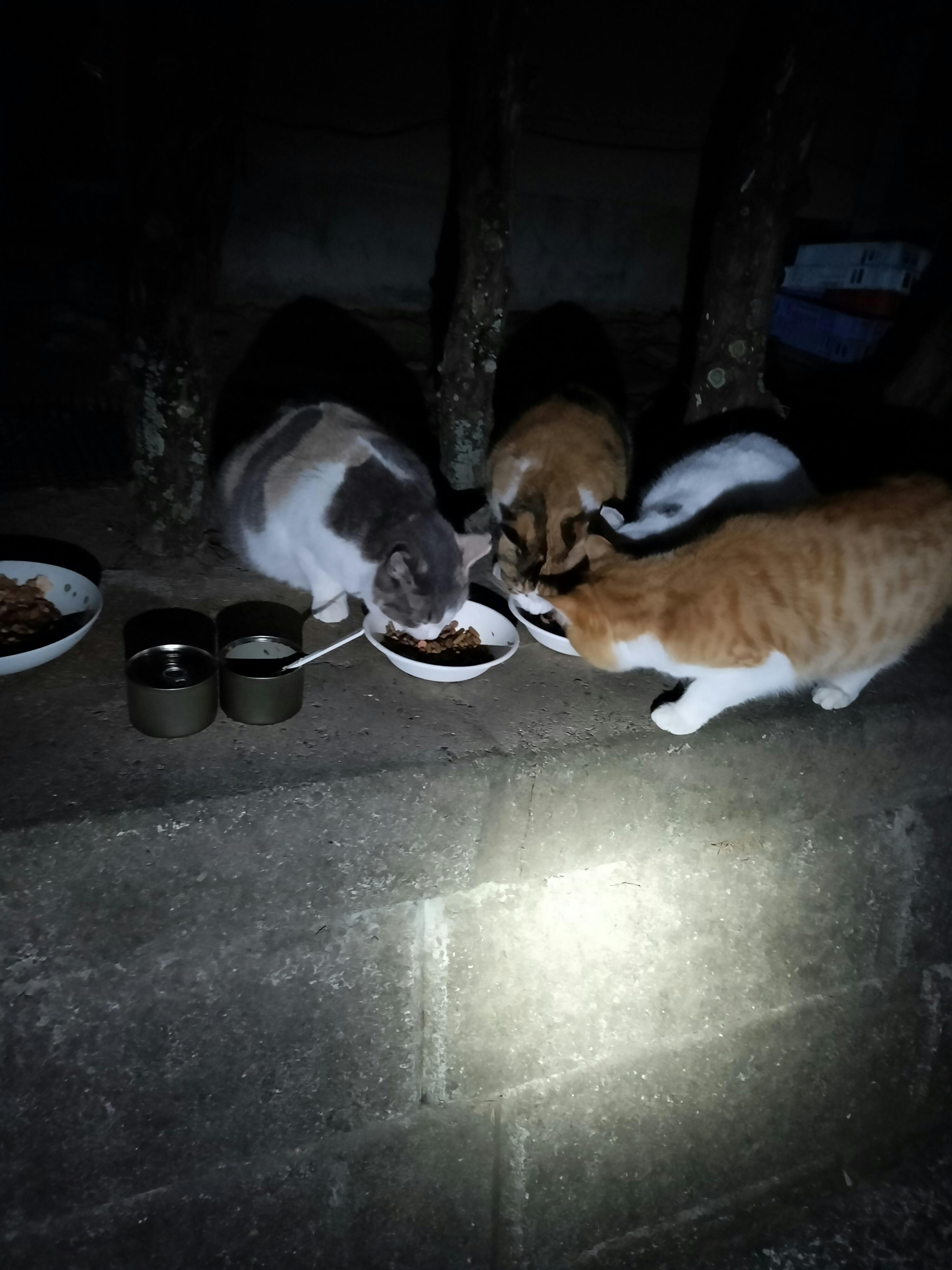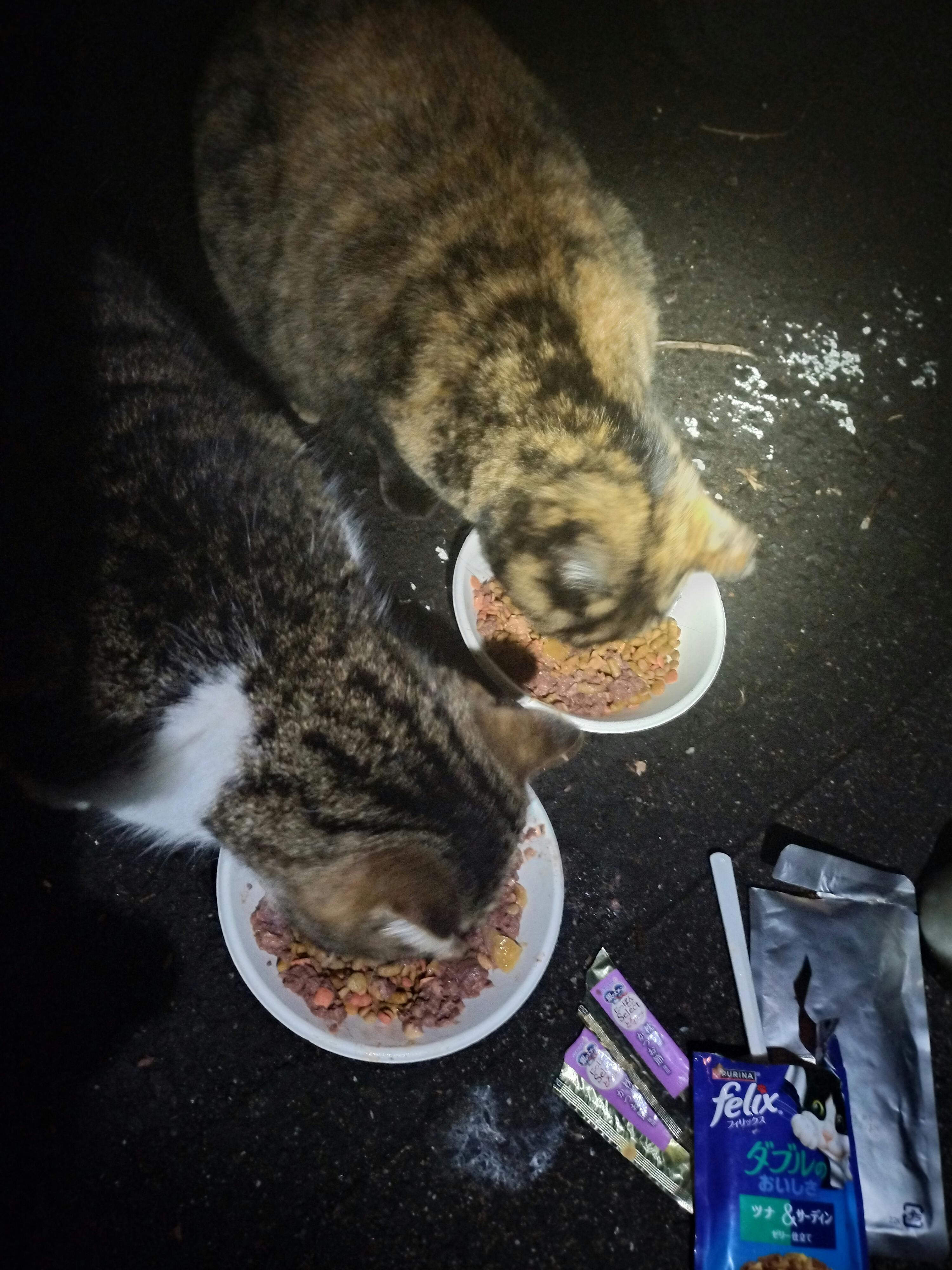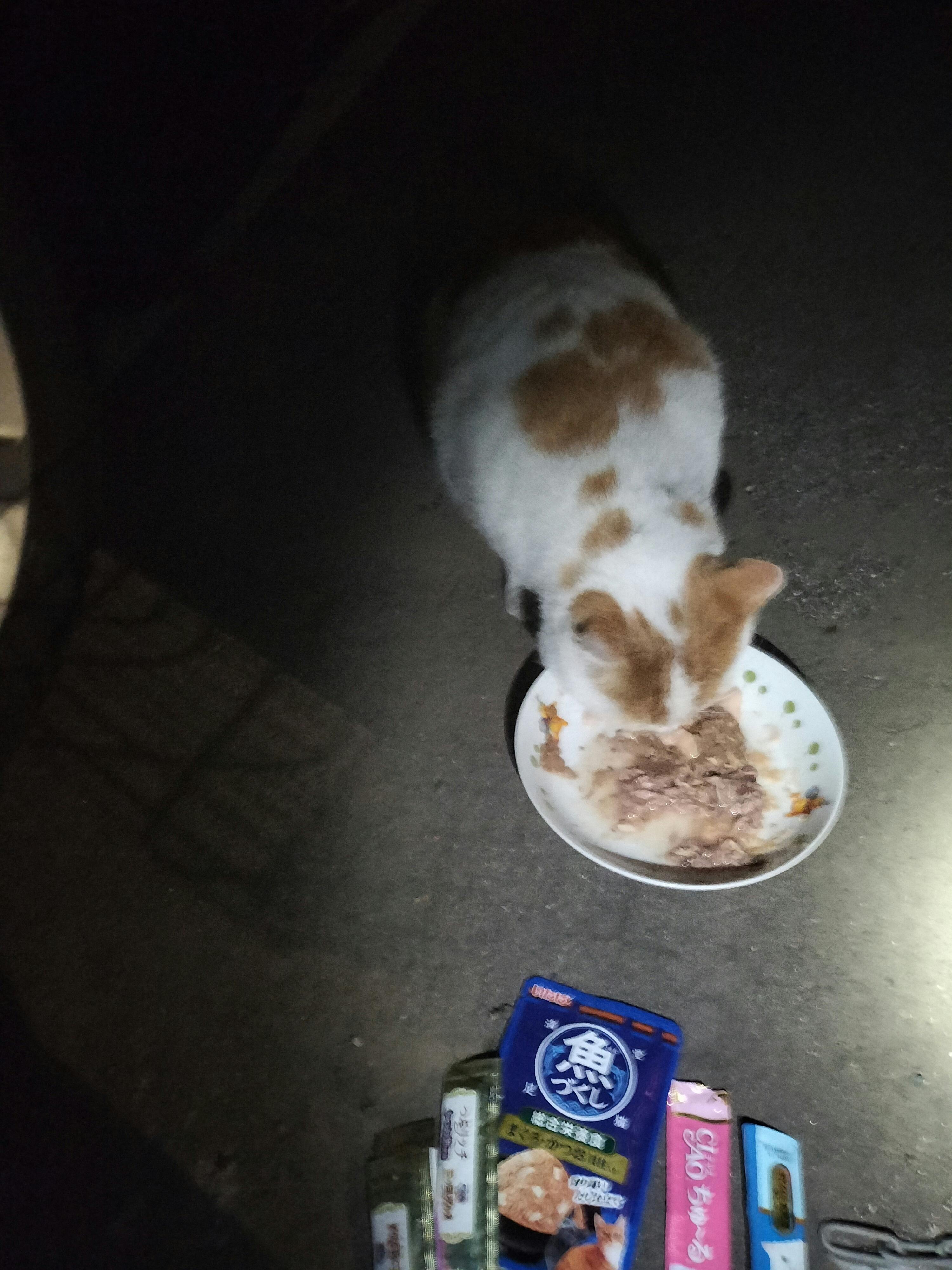 家の近くの猫達もみんな揃ってご飯を待っていました。 一昨日餌をあげていましたら、近くの住人の60代の人が歩いてきました。こんばんは、と言いましたら、夜中に怪しいことをしていると警察が来ますよと言われました… はい、すいませんととりあえず謝りましたが、ぶつぶつと言いながら、いきましたが、確かに怪しい時間帯ですが、なんだか気分も落ち込みました。 次の日からは遠くに車を止めて、歩いていきました。 猫達は遠くから私だと気が付いたようで、お迎えに来てくれました。 やっぱり1日2回ご飯をあげないと誰からもご飯がもらえていない様です。