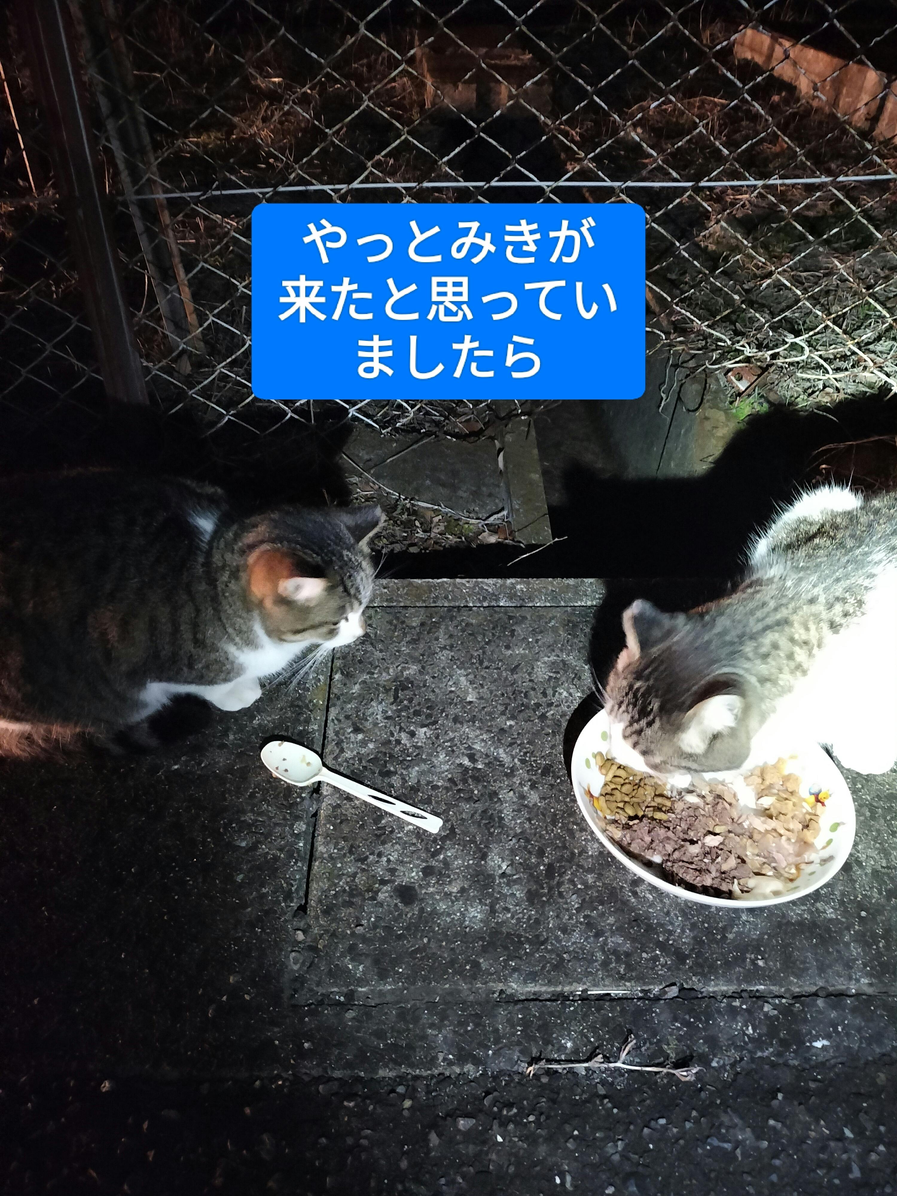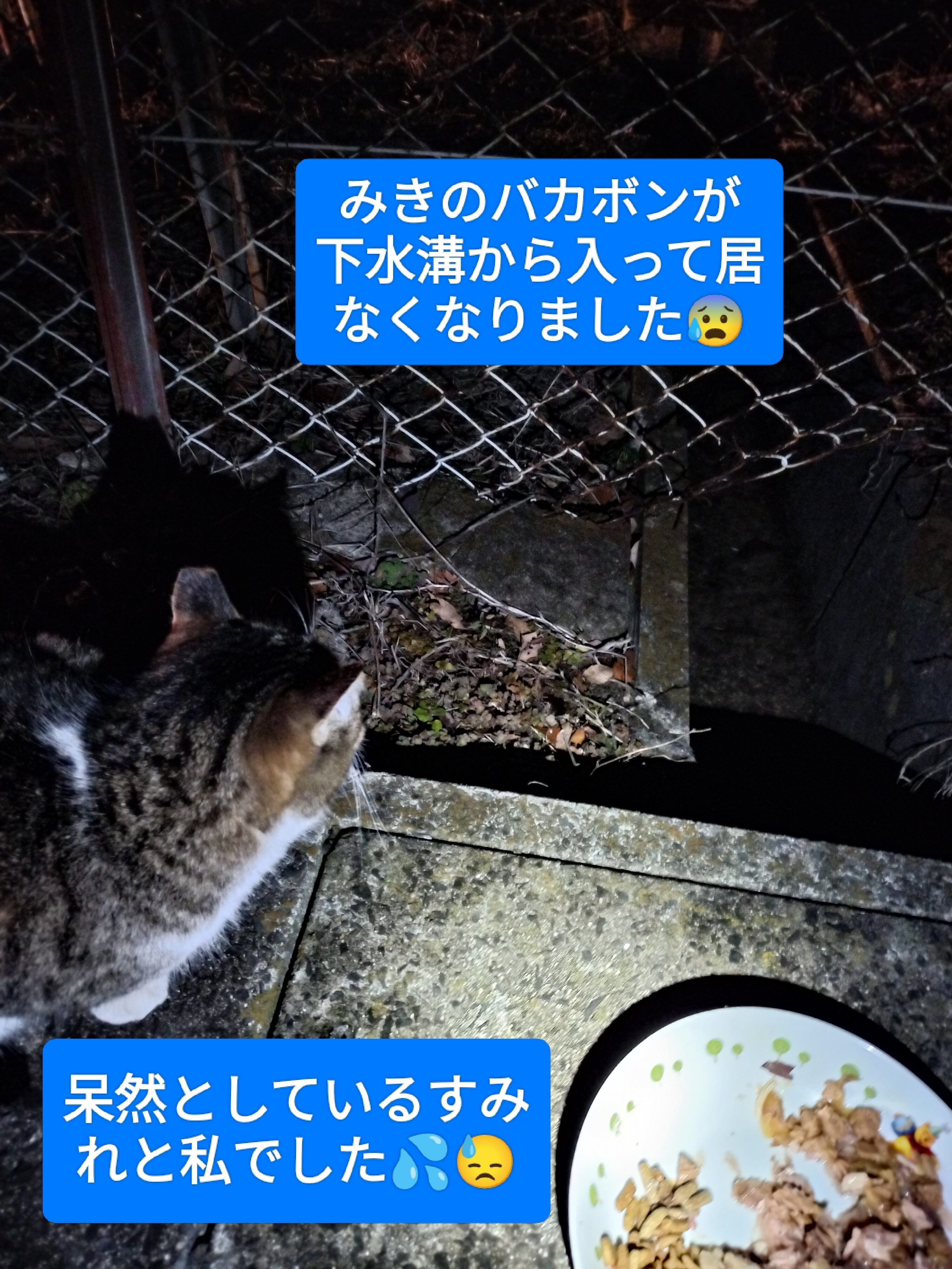 腹ペコ3匹のハチワレ君が居なくなったばかりなのに…みきまで?みきの世話してもう早8年になりました。みき達に対する愛情の深さも言葉では言い尽くせん、 今日は出てくることをを祈っています。