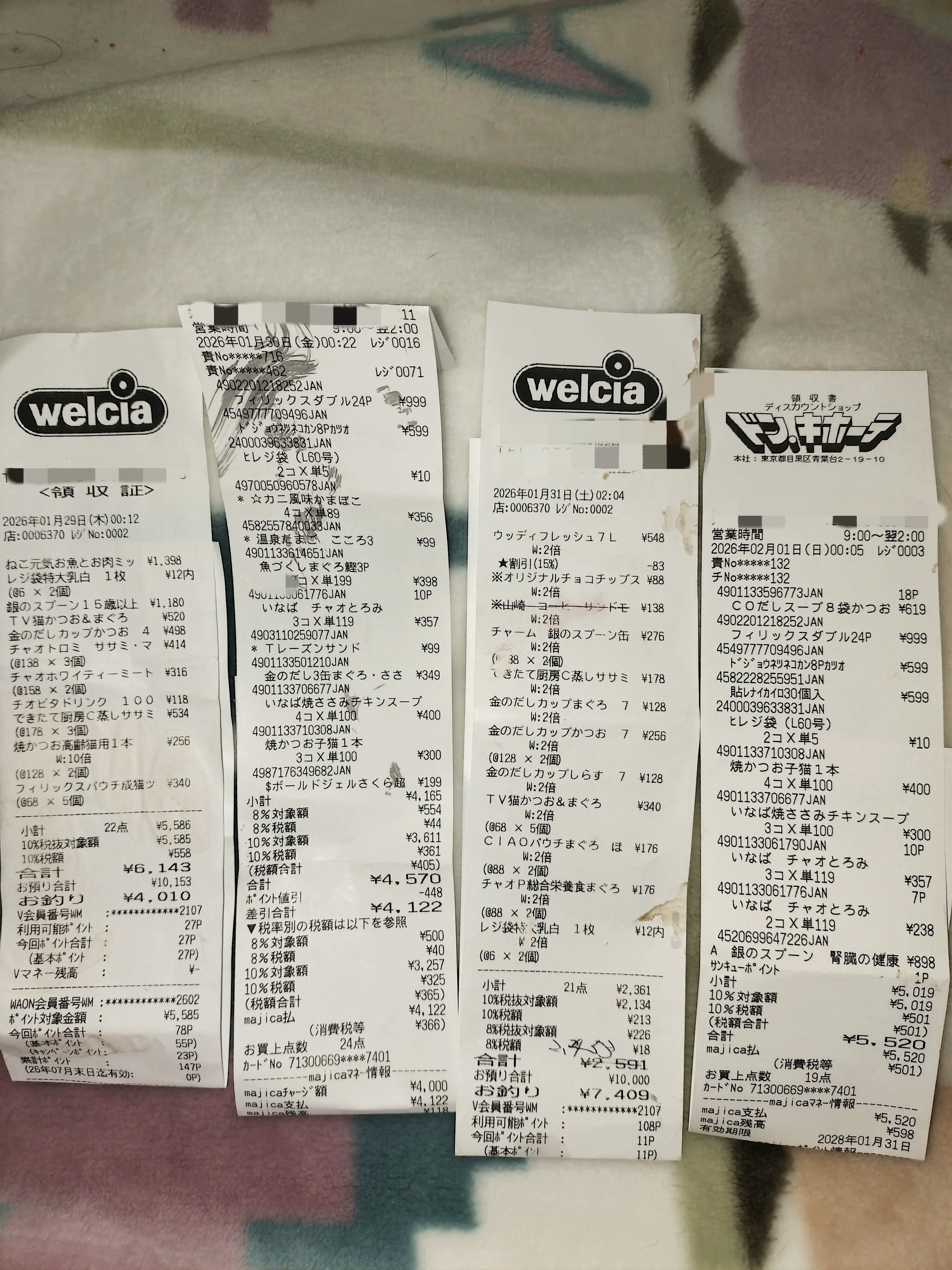 頂いた支援金で沢山の猫フードを買いました。とても感謝しています。今回の支援金で、光熱費と経費も計上させて頂きます。灯油のの消費量がとても早いのです、隙間だらけの古い家なので、常にファンヒーターを2つ付けてないと寒むくて、猫達も風邪が治らないのです。本当に支援者様方に助けられています。