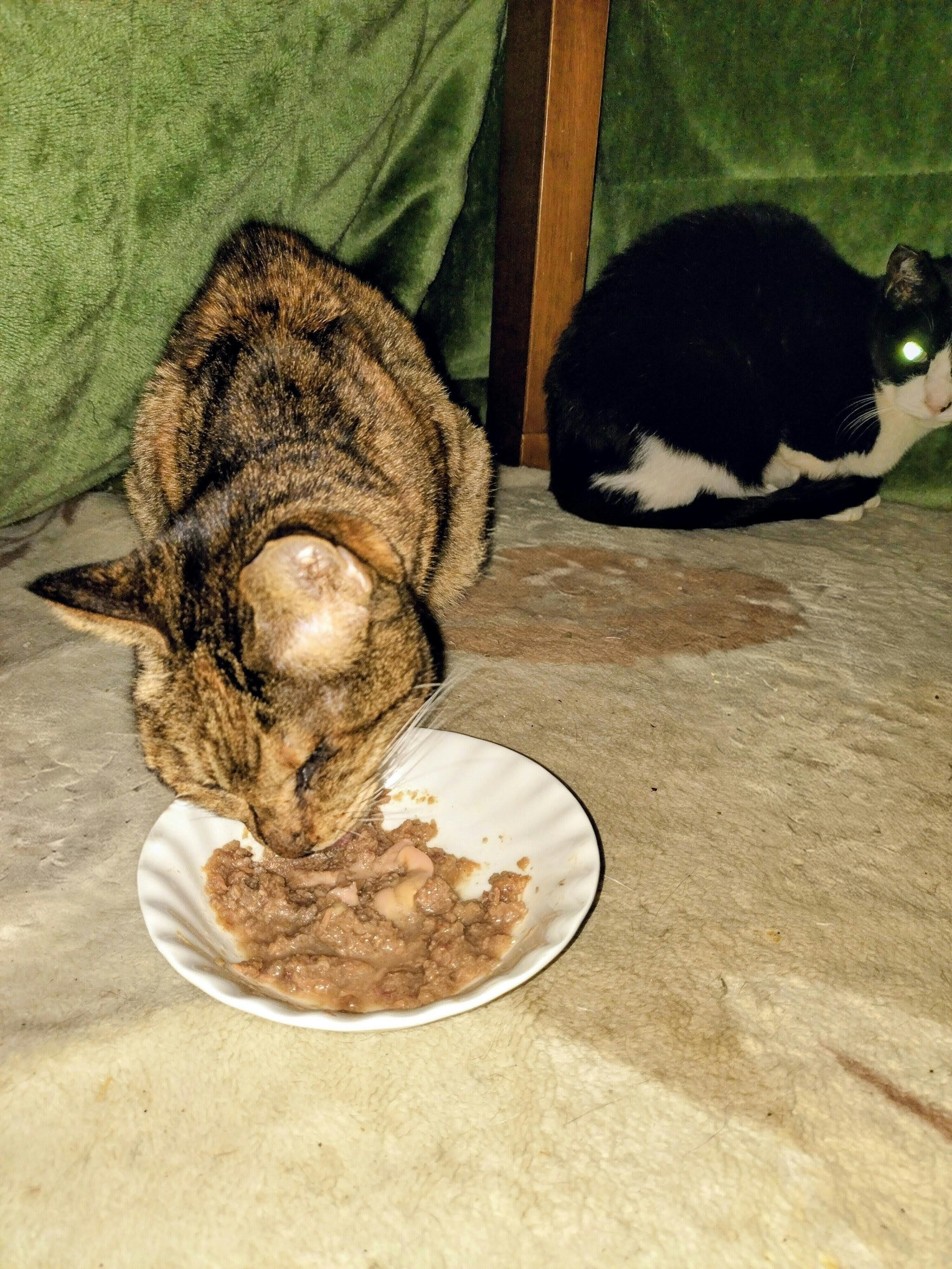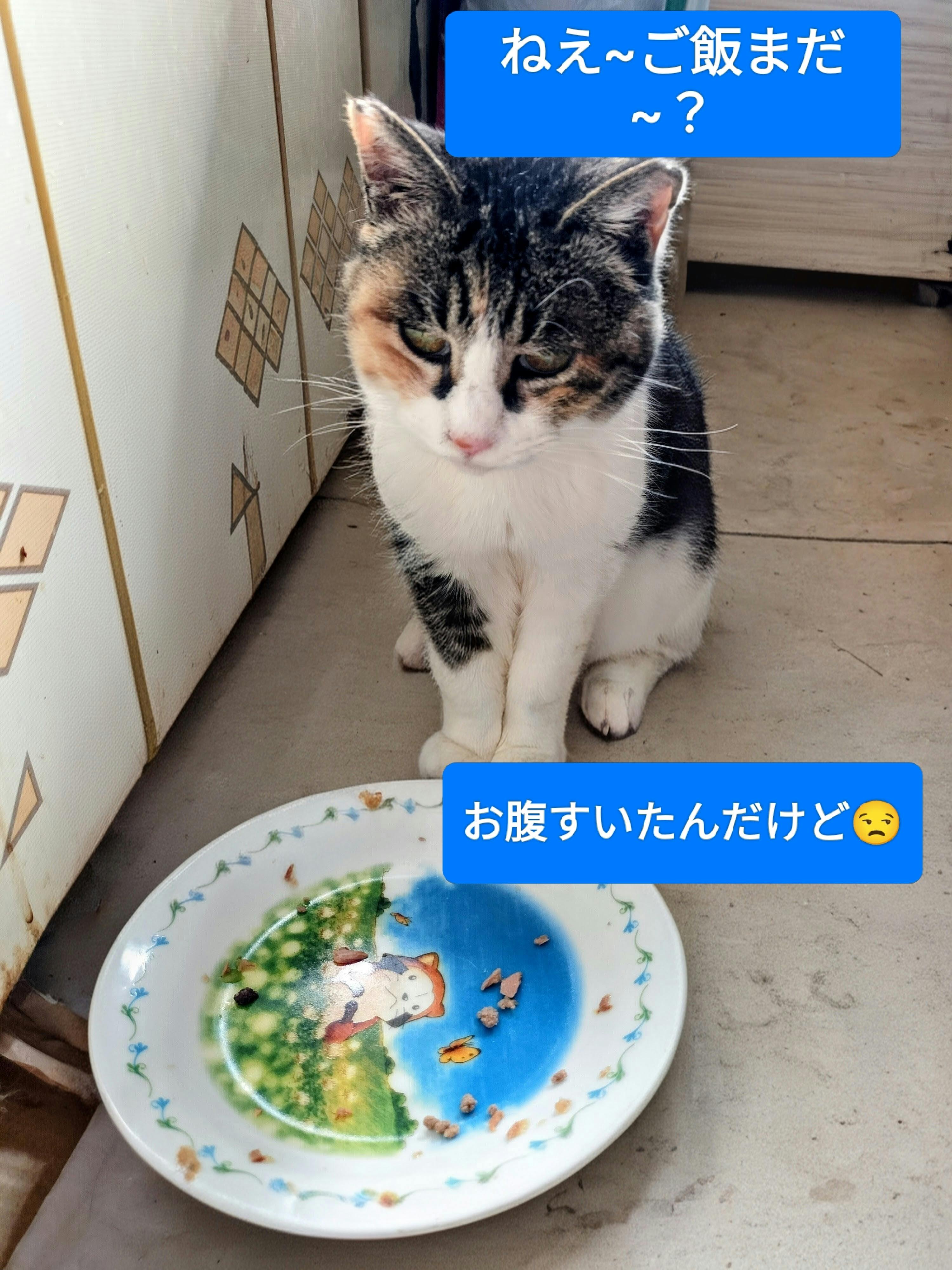 小ミケちゃんも元気を取り戻しまして、毎日の定位置がここです。私が家に帰ってきますとお皿の前に走って行きます。ずっと鳴かずにただ待っているのです。 なんとも可愛らしいのです。もう全くカリカリを食べれなくなりました。本当に小さいながら、痩せの大食いなのです…