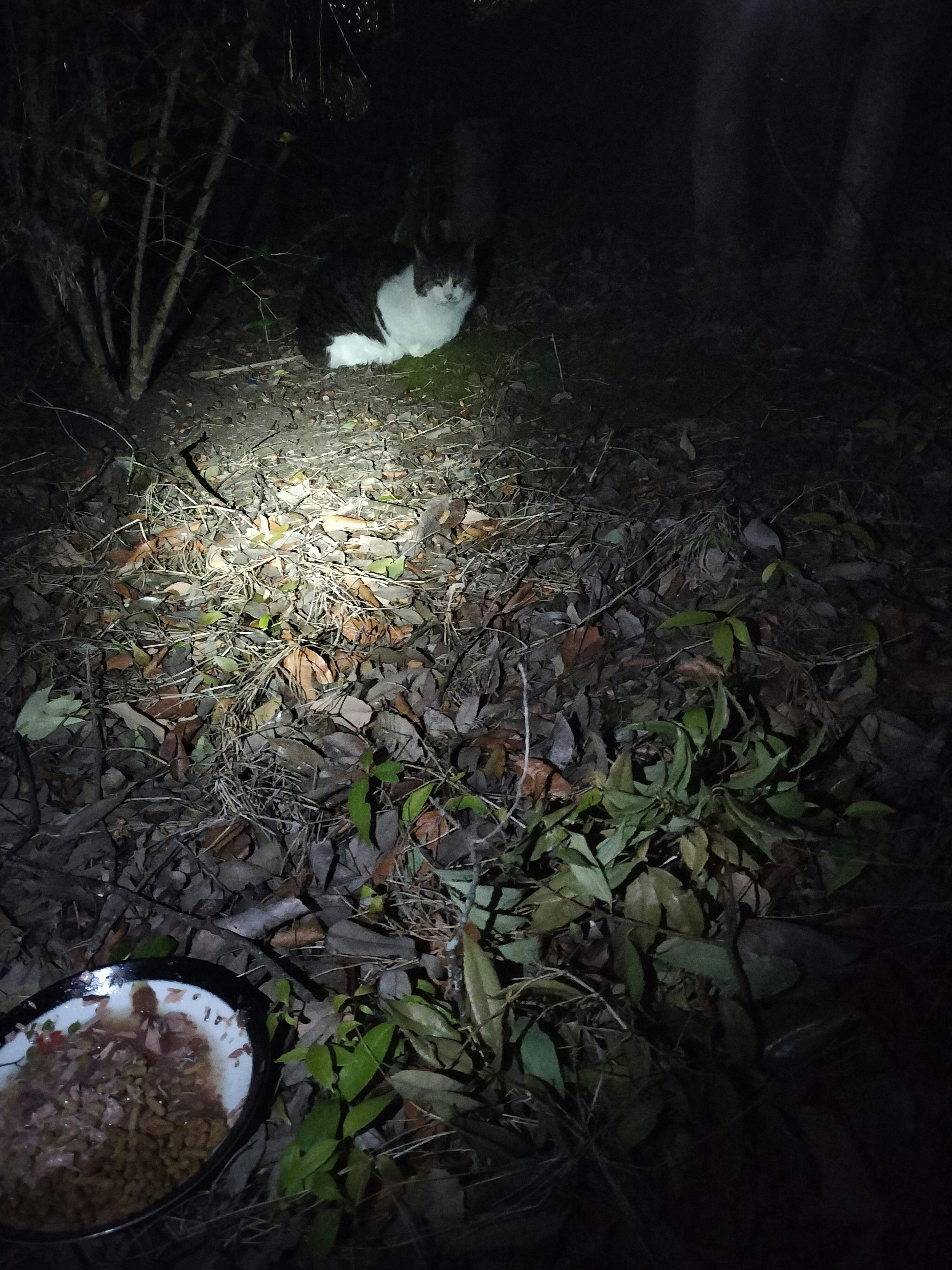 モカちゃんとみき君が草むらから私を呼んでいました。ご飯を外に用意しても、出てきませんので、草むらの中で食べさせました。 近くにはサスケ君が睨みを効かせていました。