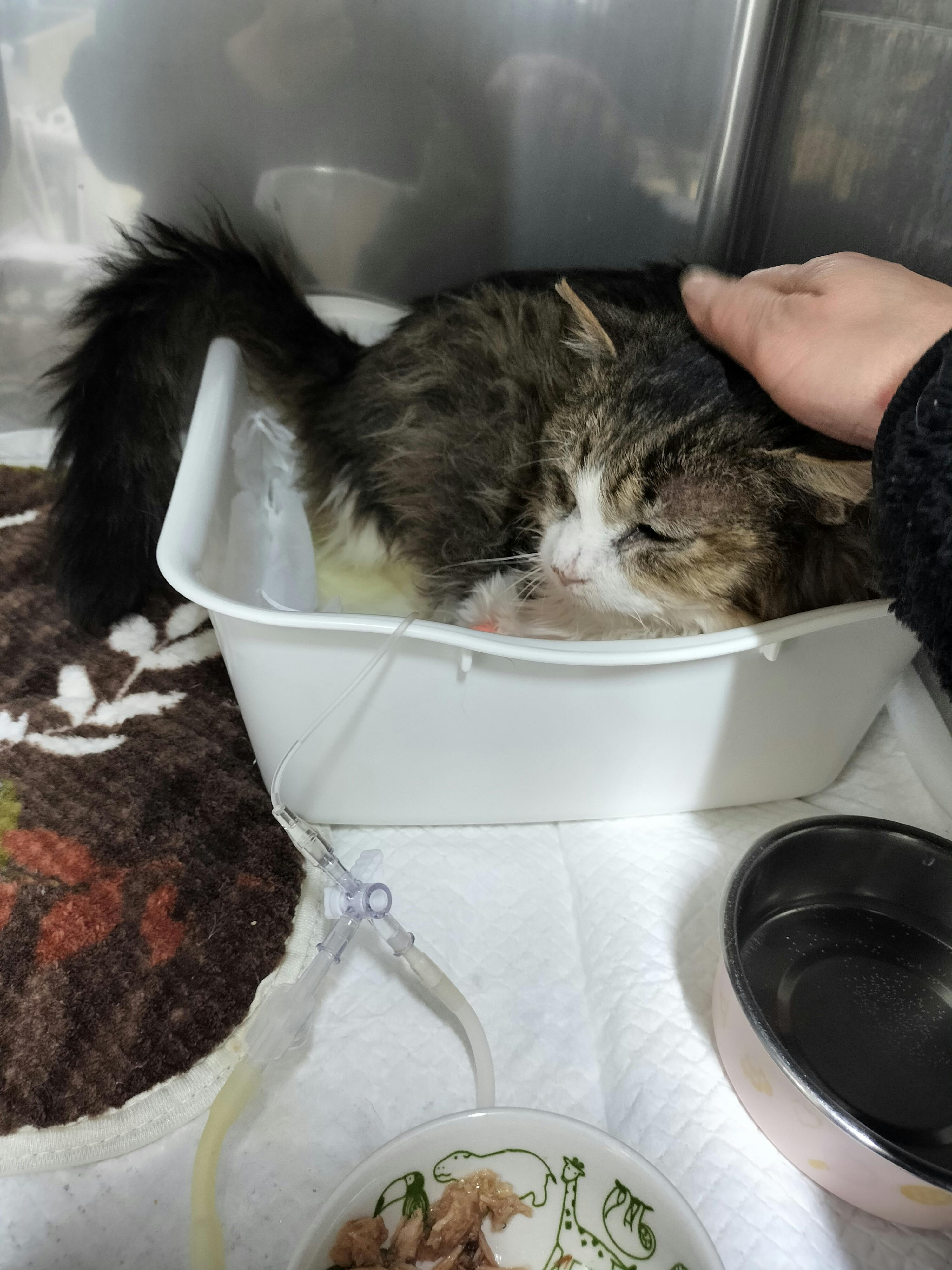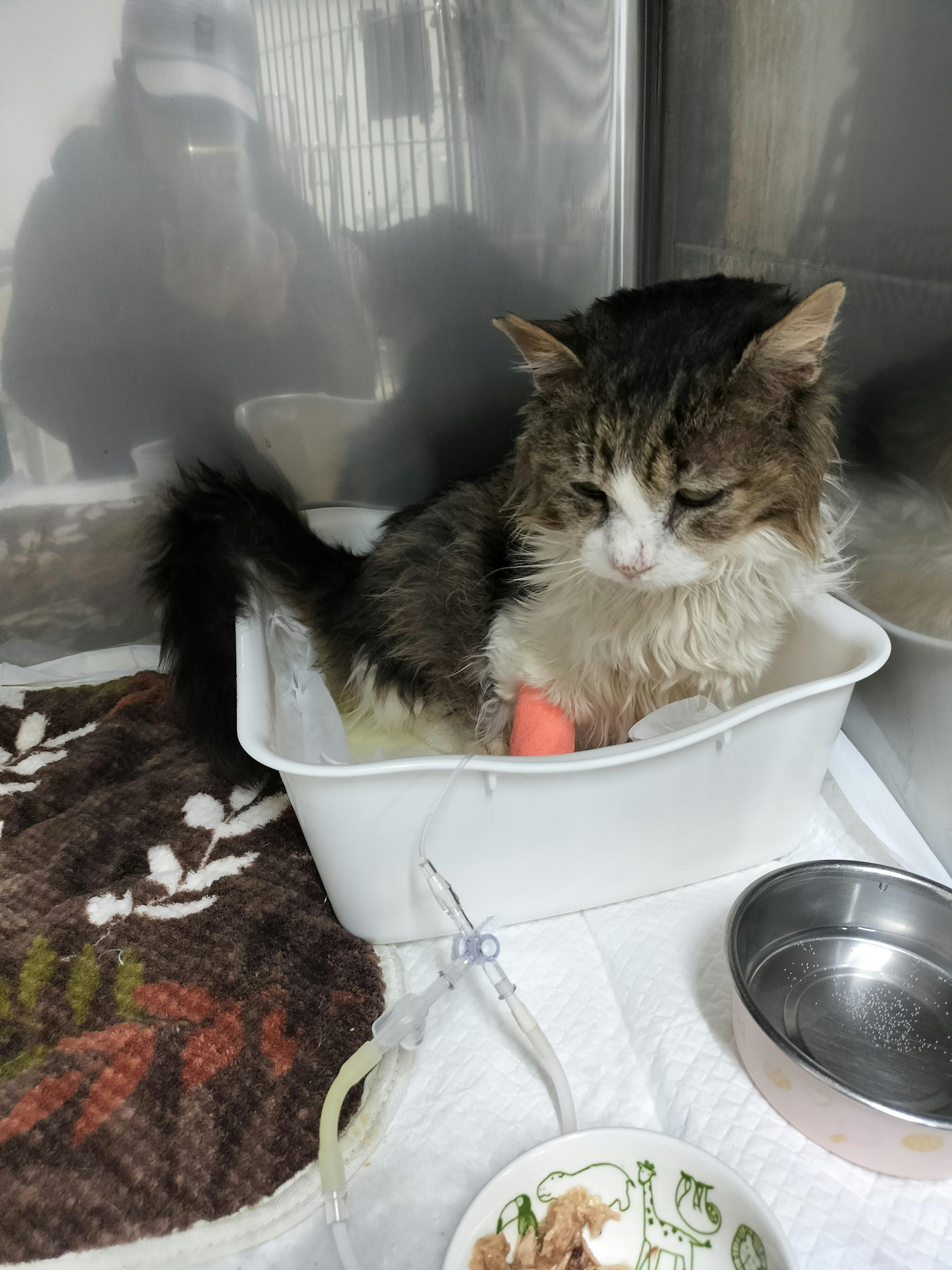 オシッコをしたと思っていましたら、オシッコの上で座ってしまいました… ずっとお腹を出しては、撫でてくれ~と甘えていました。 血圧はまだ、下がらないそうですが、糖尿病が酷くなると出てくるケトン体はかなり下がったと言われました。毎日インスリンの点滴をしていますのて、安定して来たら、注射だけになるするそうです。 おそらく2日、3日で退院出来るとの事でした。 狭い病室で居心地は良くないですが、凄くお利口さんだそうです。ご飯もちゃんと食べている様でした。 小五郎は家にまだ来たばかりなので、あっという間に亡くなってしまいのは、あまりにも悲しいです。 せめて、小五郎に出来るだけのことをしてあげないと、私自身がバチがあたる様な気がしています。