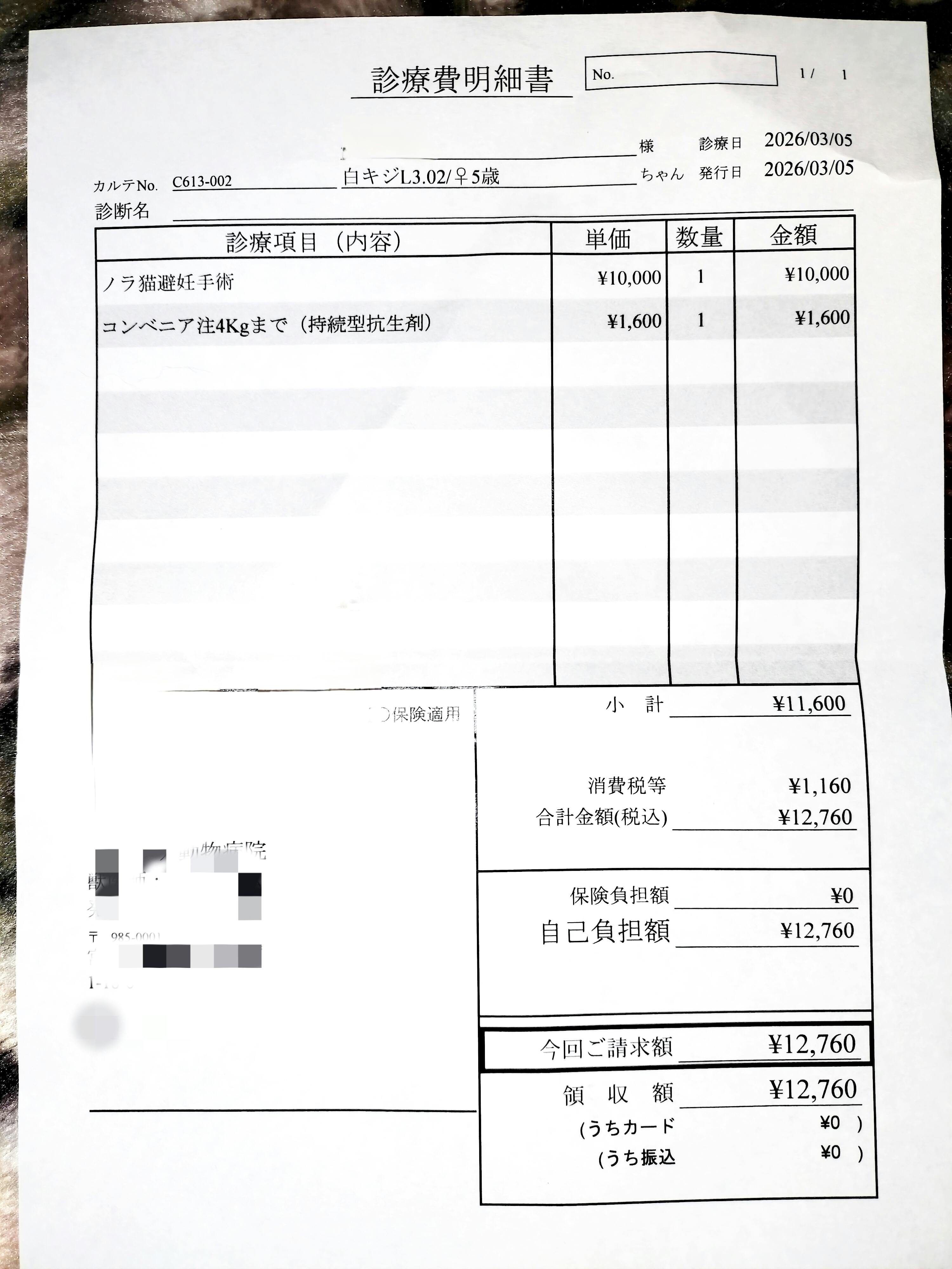 手術は結局別の病院に連れていきました。野良猫料金でやすいのですが、コンベニアの炎症止めの注射をしてくれない病院なのですが、昔からの知り合いの先生でしたが、以前色々とありまして、ケンカをしてからは全く行ってませんでした。 ですが、予約とかはいらない病院なのです。 多頭飼のおばあちゃんにお話をして、一緒に行って来ました。 珍しく、コンベニアを打ってくれました。 昔も打ってくれませんでしたので、手術後の猫を別の病院でコンベニアを打って来たのです。多頭飼のおばあちゃんには、コンベニアを打って下さいと頼んで見て下さいねとお願いをしましたが、猫だけを置いて、何も言わずに出て来ました。45後に来て下さいと言われたそうです… 引き取りに行くときにコンベニアを打って下さいと言って下さいねと言いましたら、コンベニアは打ちましたよと言われたそうです。 安心しました。