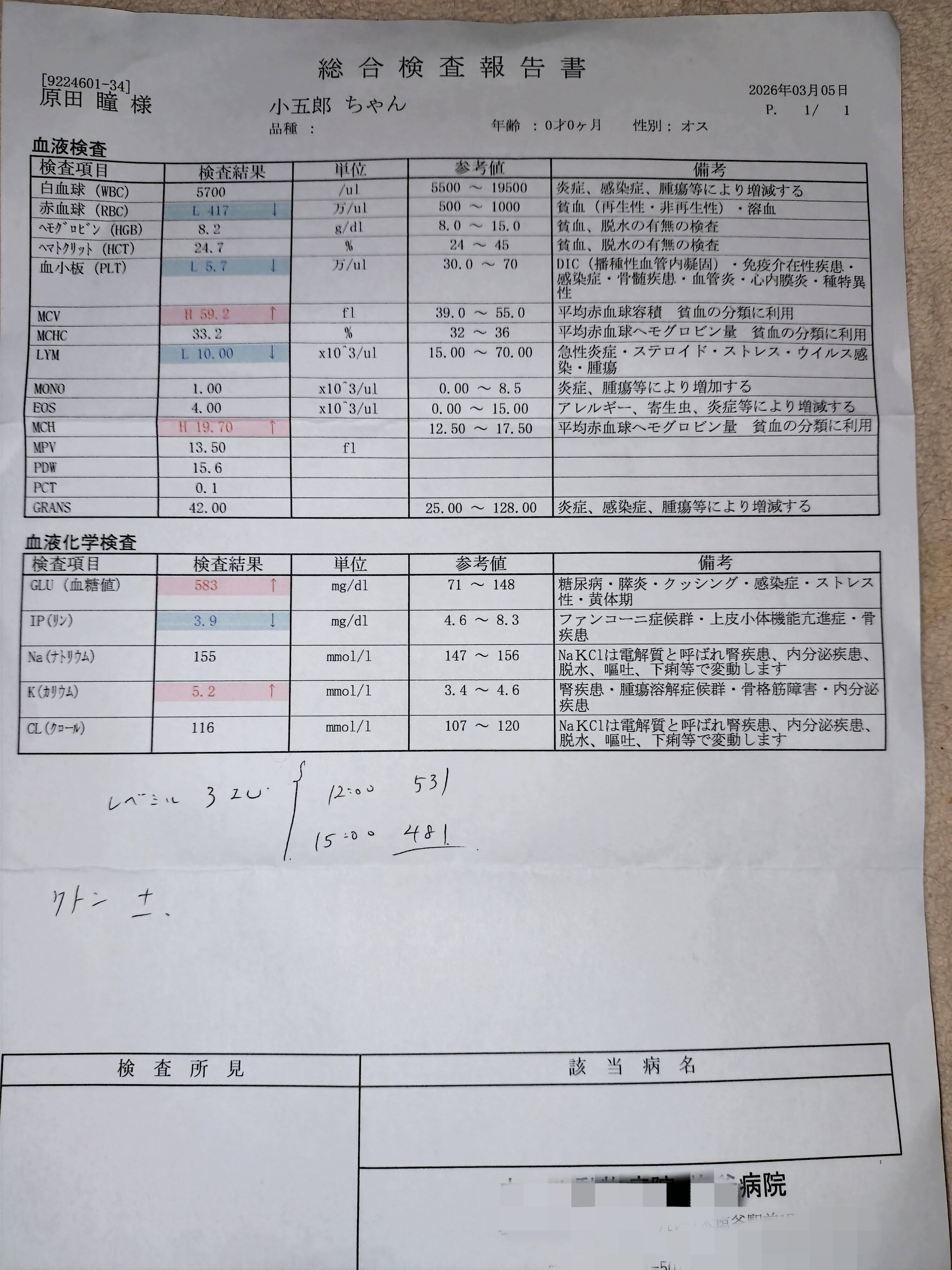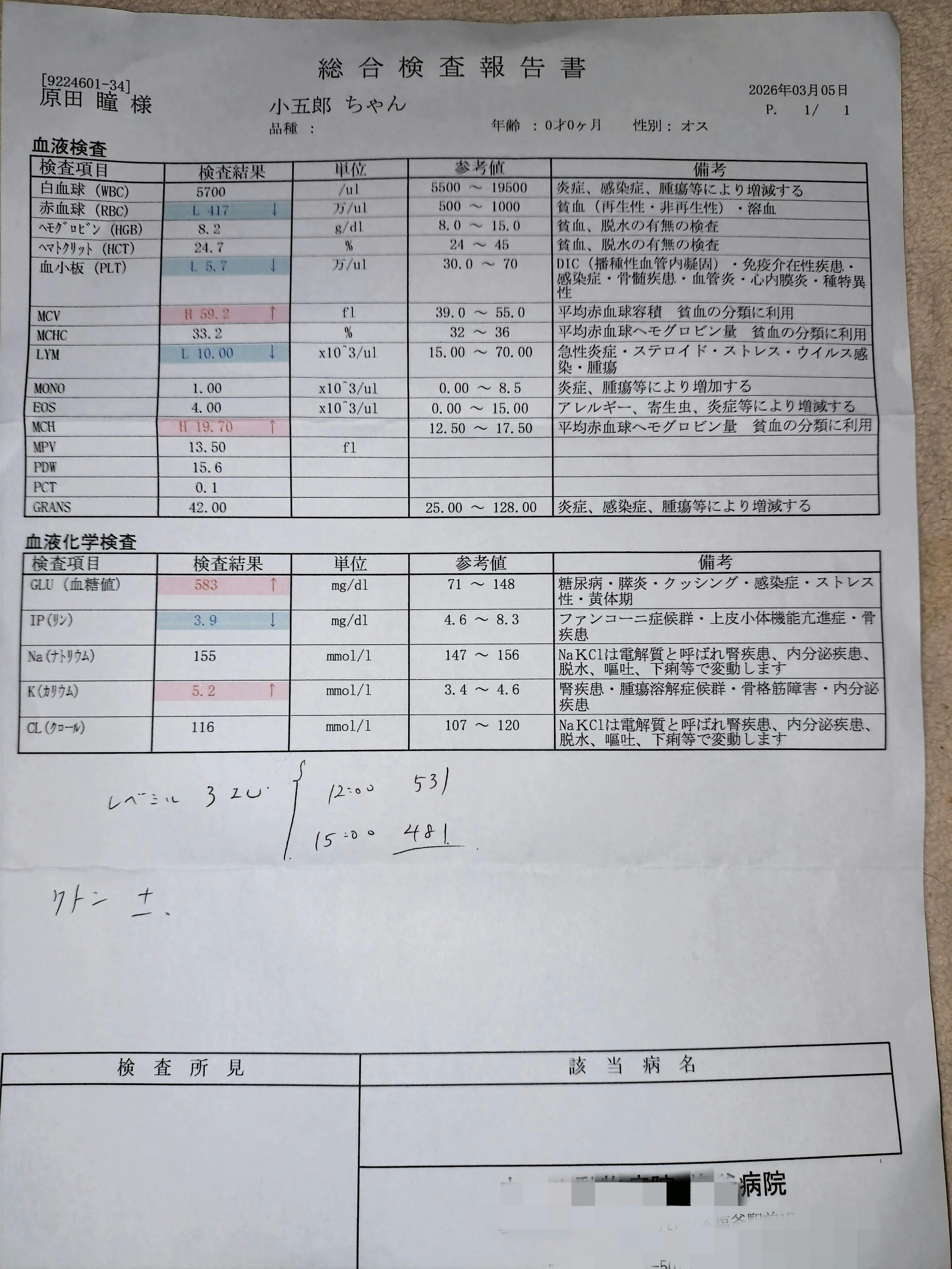 血糖値がもう少し落ちないと退院ご出来ないそうです。前回の検査結果をもらえなかったのですが、ミミちゃんの注射のお代金も小五郎の退院時にまとめて請求しますと言われて来ました。あと、2日間位で、小五郎の退院のめどか付くかと思いますと言われて帰ってきました。怖くて入院費用を聞けませんでした。 支払いは退院当日と言われました。今月中ではだめですか?と聞きましたが、駄目とのことでした… 昔みたいな余裕も与えてくれません。 動物病院ですが、お金が無くては病院も猫の為に何もしてくれません。これが現実なのだと昔から自分の無能さに打ちのめされています…