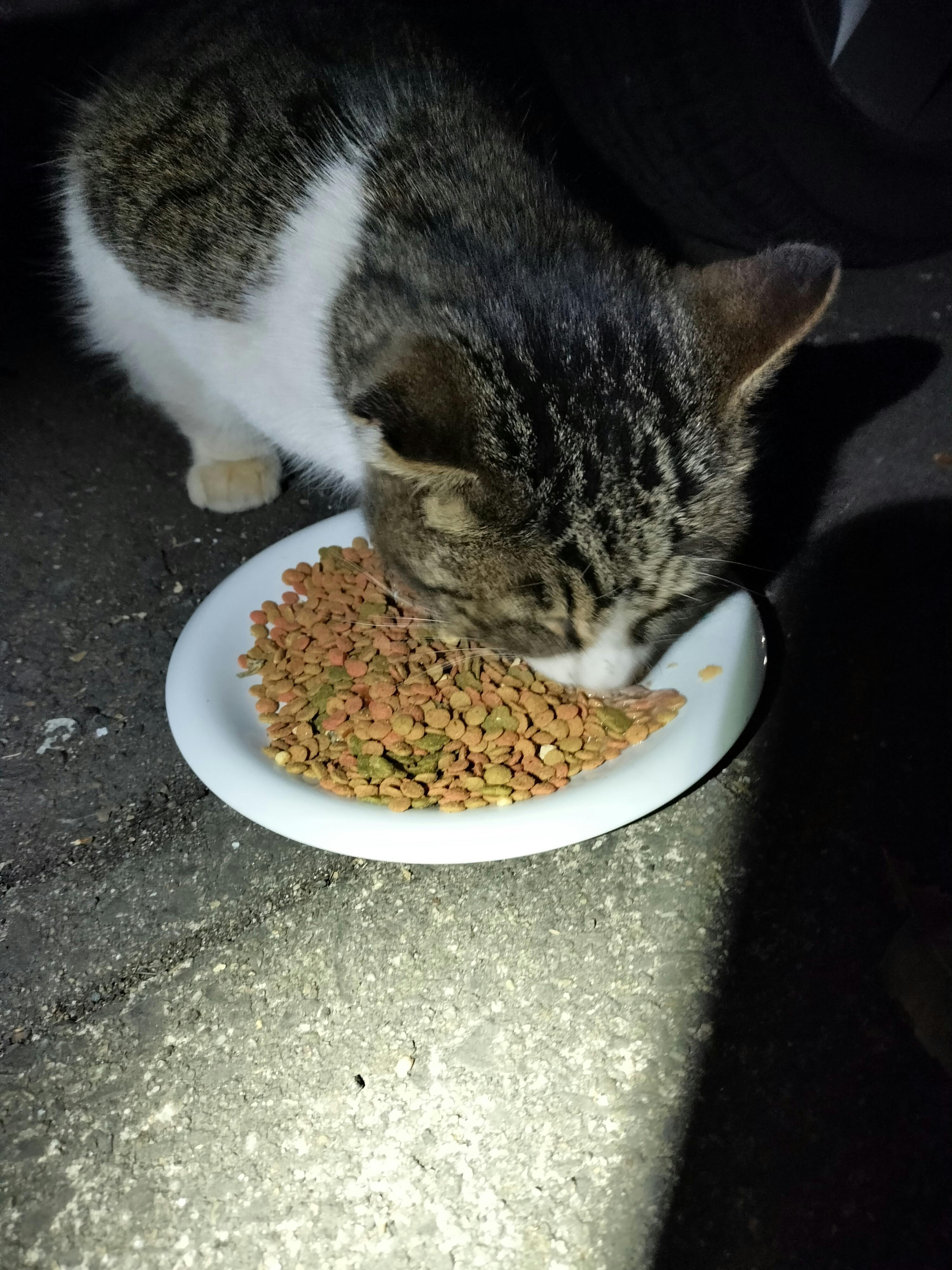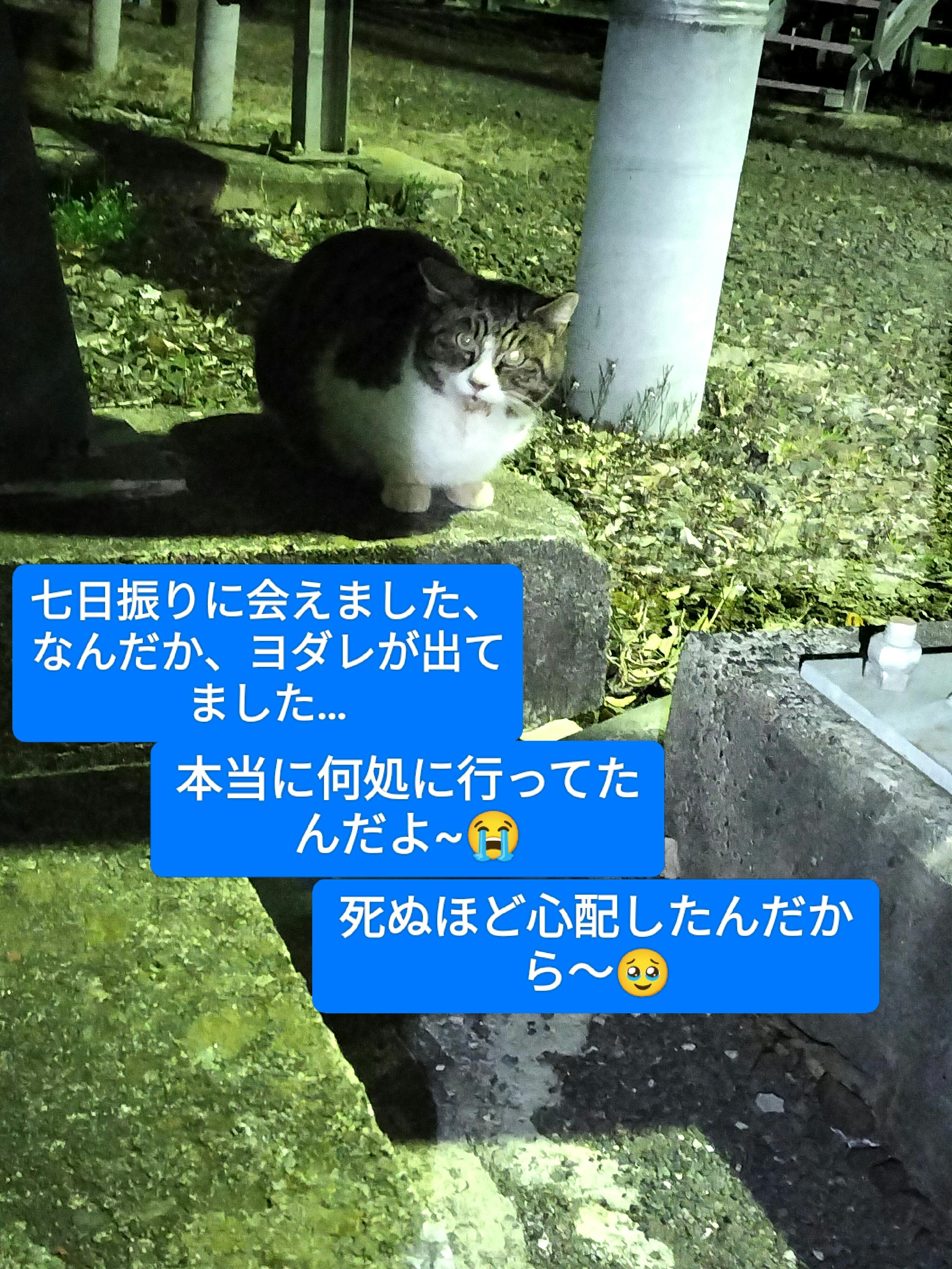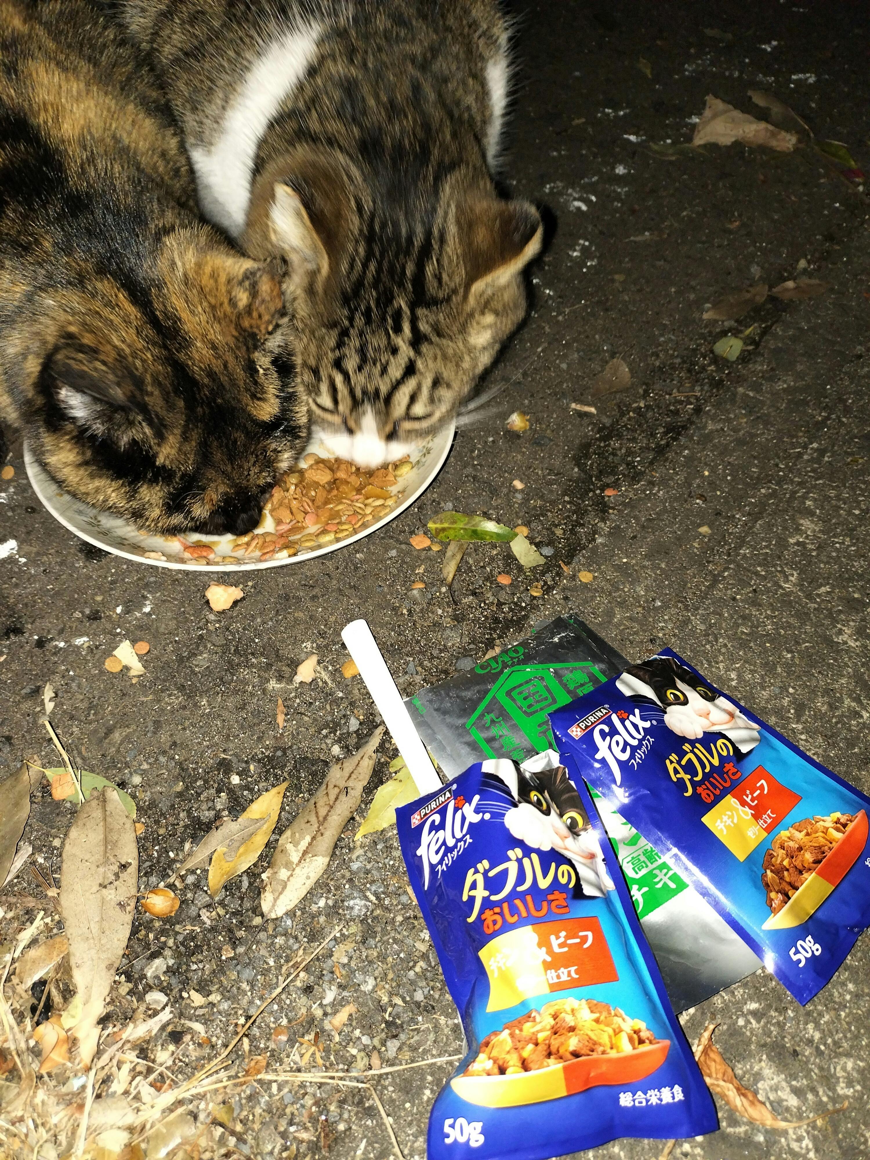タイガー〜何処に行ってたんだよ、心配したぞ。早くご飯食べて~と、急いで、ご飯を用意しました。 いっぱいご飯を食べてくれました。もう本当に奇跡以外の何物でもなかったです… ずっと毎日ミューちゃんだけしかいなかったので、本当にミューちゃんが可哀想でした。もう、一人ぽっちにはさせられないなあと覚悟をしていました。 タイガーは何処に行ってたんだろうか、何処かの建物に入り込んでいたのでしょうか? 何を食べていたのだろうか? 公園の中には、誰かがいつもカリカリを置いていってくれているようですが、みきとモカちゃんだけ食べているのです… タイガーは公園の中には行かないのです。