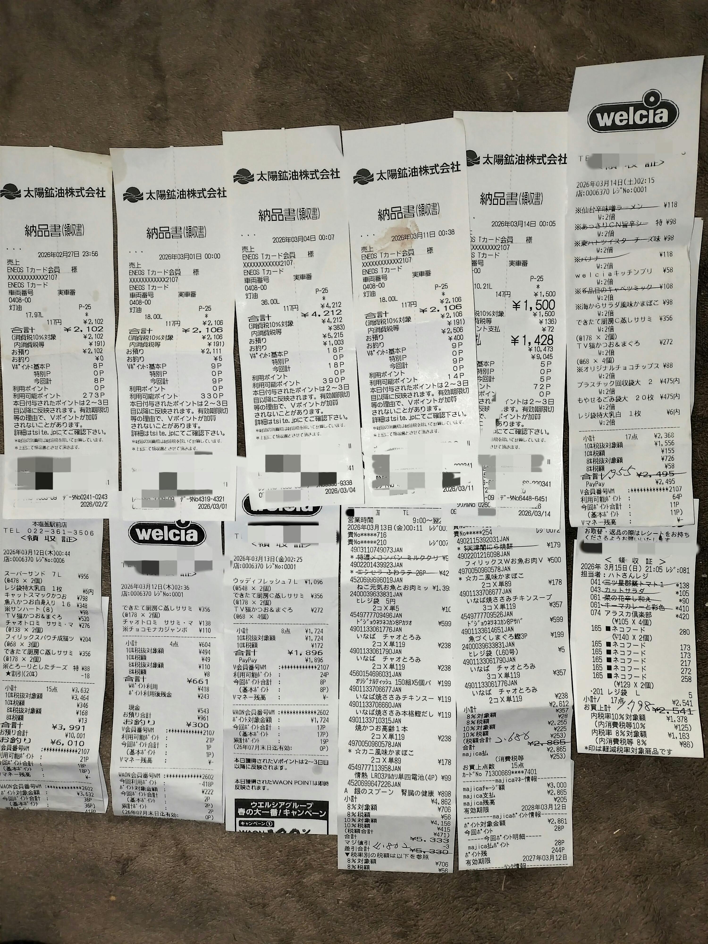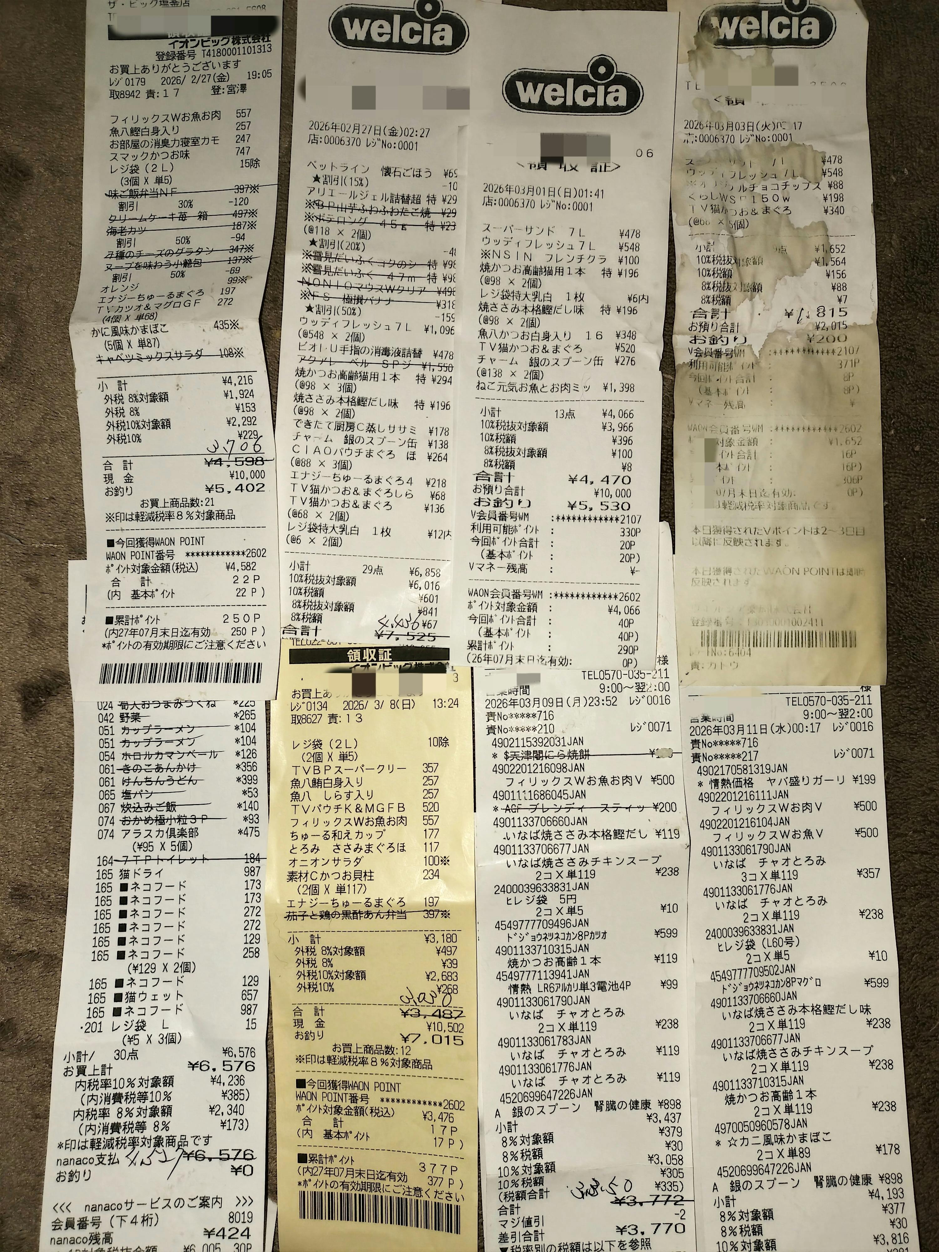 猫達のフードのお買い物の領収書を貯めてしまいました。 沢山のご支援に沢山の猫達が助けられました。本当に心からお礼を申し上げます。 猫達も私も本当に支援者様方に支えられました。とても、とても助かりました。ありがとうございます。