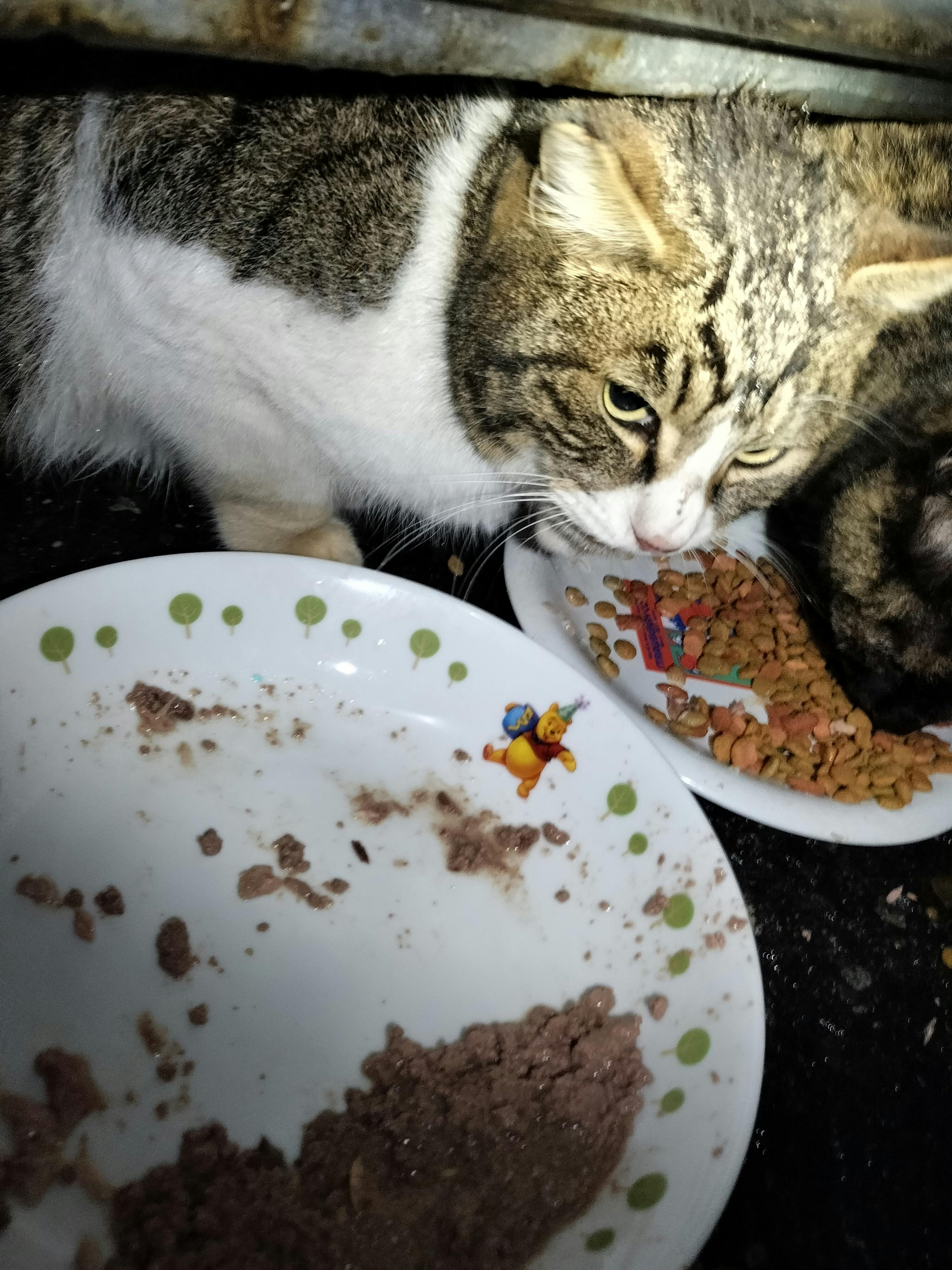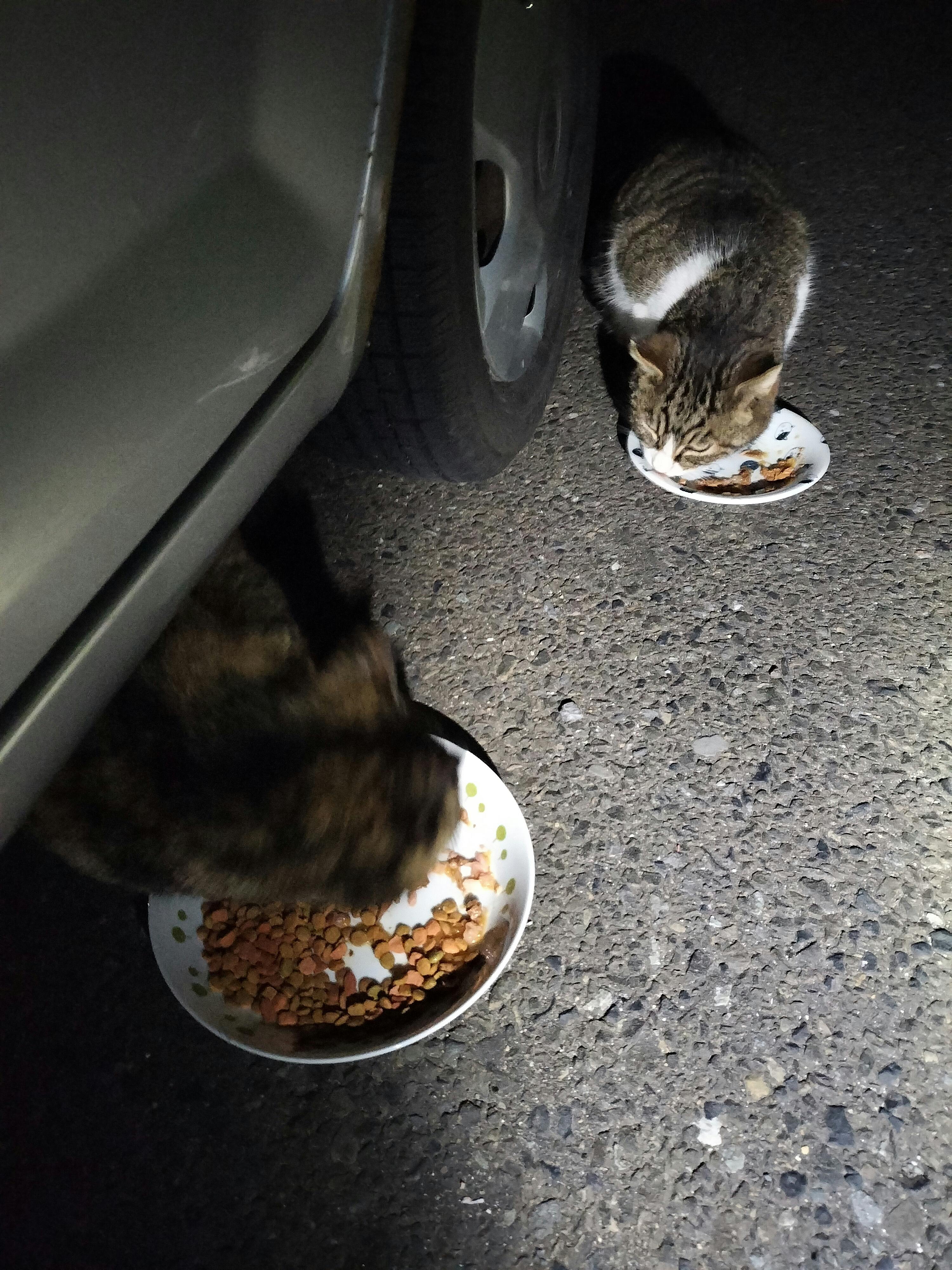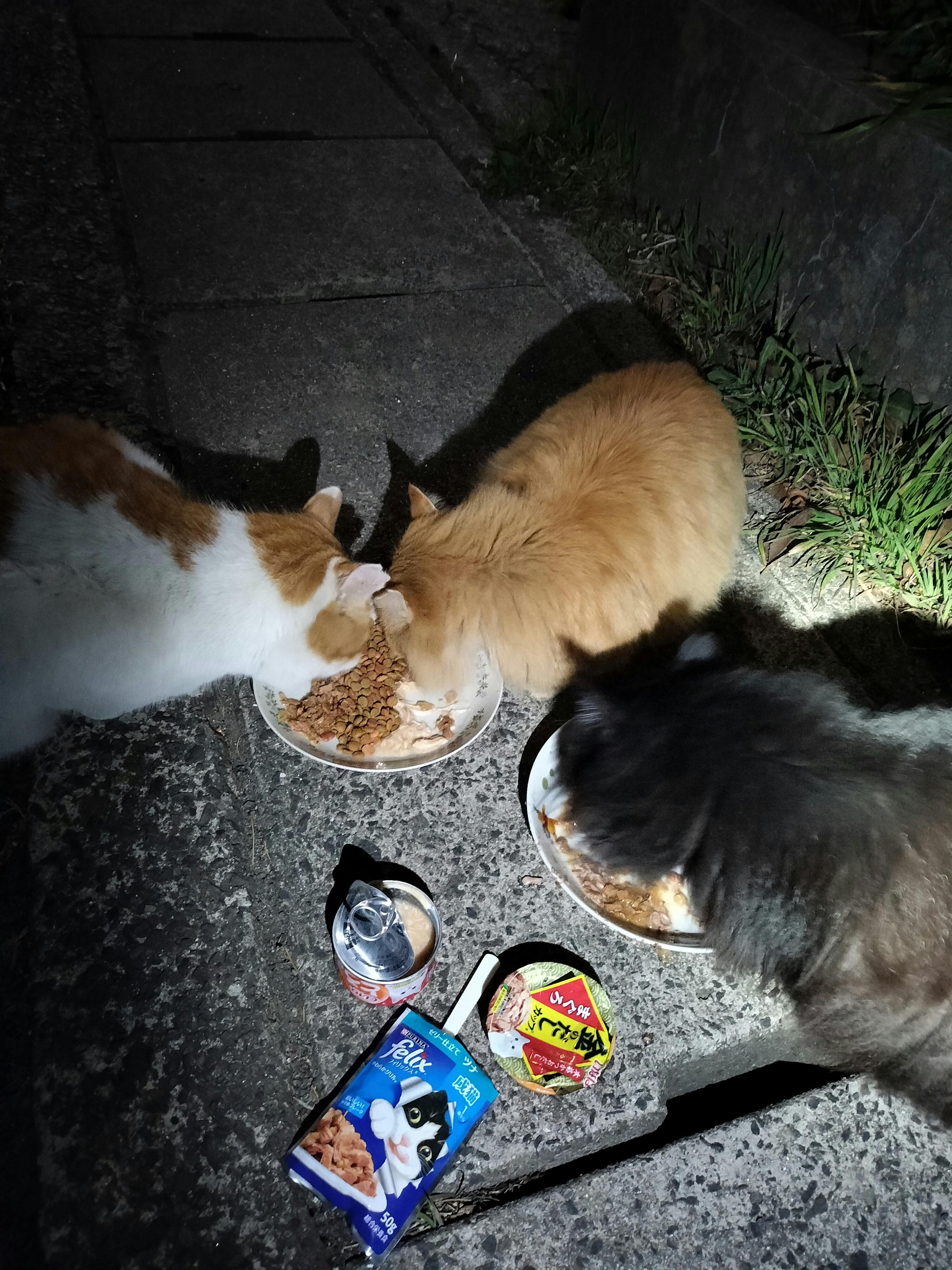 家の近くの猫達も、毎日食欲旺盛です。水入れを捨てられてしまいましたが、又、別のを用意しました。 見たことのないオス猫がご飯を待っていました…耳カットされていました。