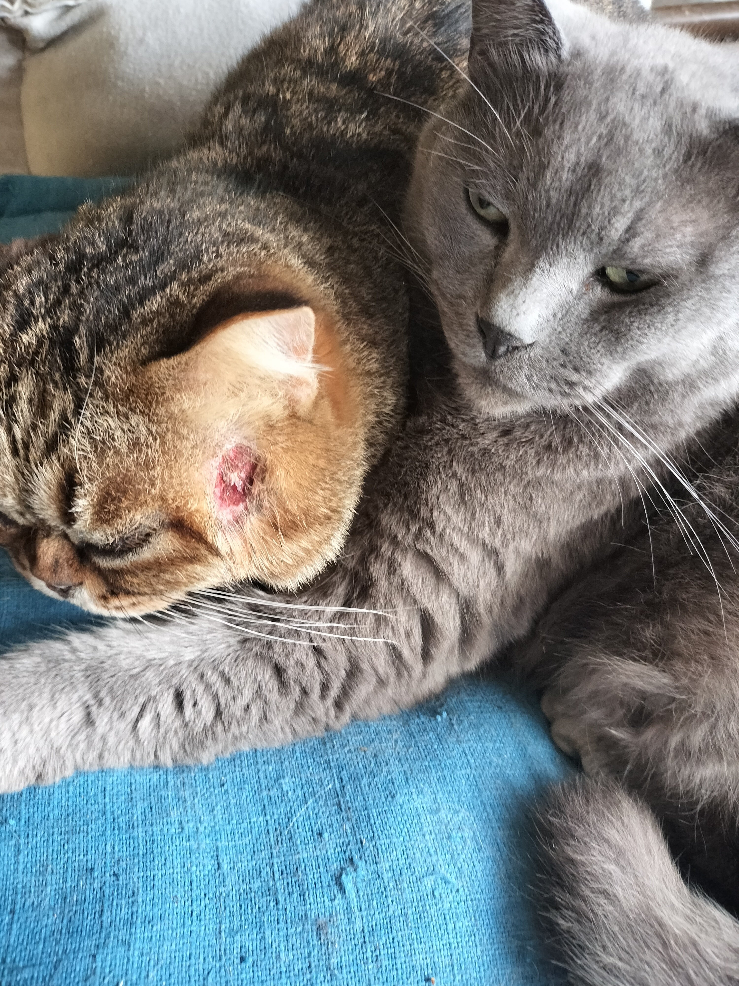 家の保護猫にゃんたーも保護した当時から、皮膚が弱い様で、全身のかゆみが酷かったのです、今も毎日薬付けなのですが、薬が切れると、痒くて血が出るぐらいにひっかいてしまうのです…あごのところも同じぐらいの傷が付いてました。 頭デッカちんで、可愛いのに、洋猫は、少し体が弱いようです。