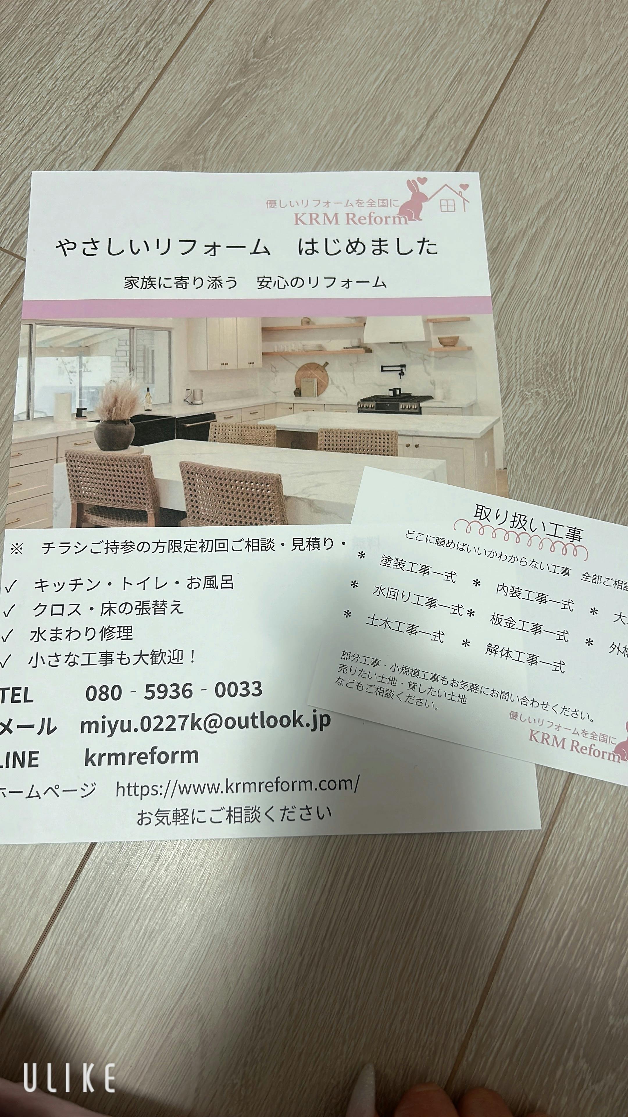 2025/12/20 22:53いつも応援ありがとうございます。KRMリフォームの安川美優です。この度、チラシが完成しました!想いを込めて、デザインから内容まで自分で考え、「やさしくて相談しやすいリフォーム屋さん」が伝わるように作りました。これから実際に地域を回り、一枚一枚ポストに投函していく予定です。まだ小さな一歩ですが、こうして少しずつ前に進めているのは応援してくださっている皆さまのおかげです。引き続き、活動の様子をご報告していきますので温かく見守っていただけたら嬉しいです。どうぞよろしくお願いいたします。KRMリフォーム安川 美優 もっと見る