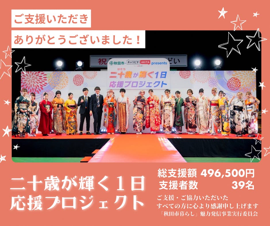 このクラウドファンディングを通して、秋田市の未来を背負って立つ二十歳の仲間たちの門出を祝福し、若者たちがこのまちに誇りと愛着を育んでくれることを願っています。一生に一度の「二十歳の門出」を一緒にお祝いしてください!