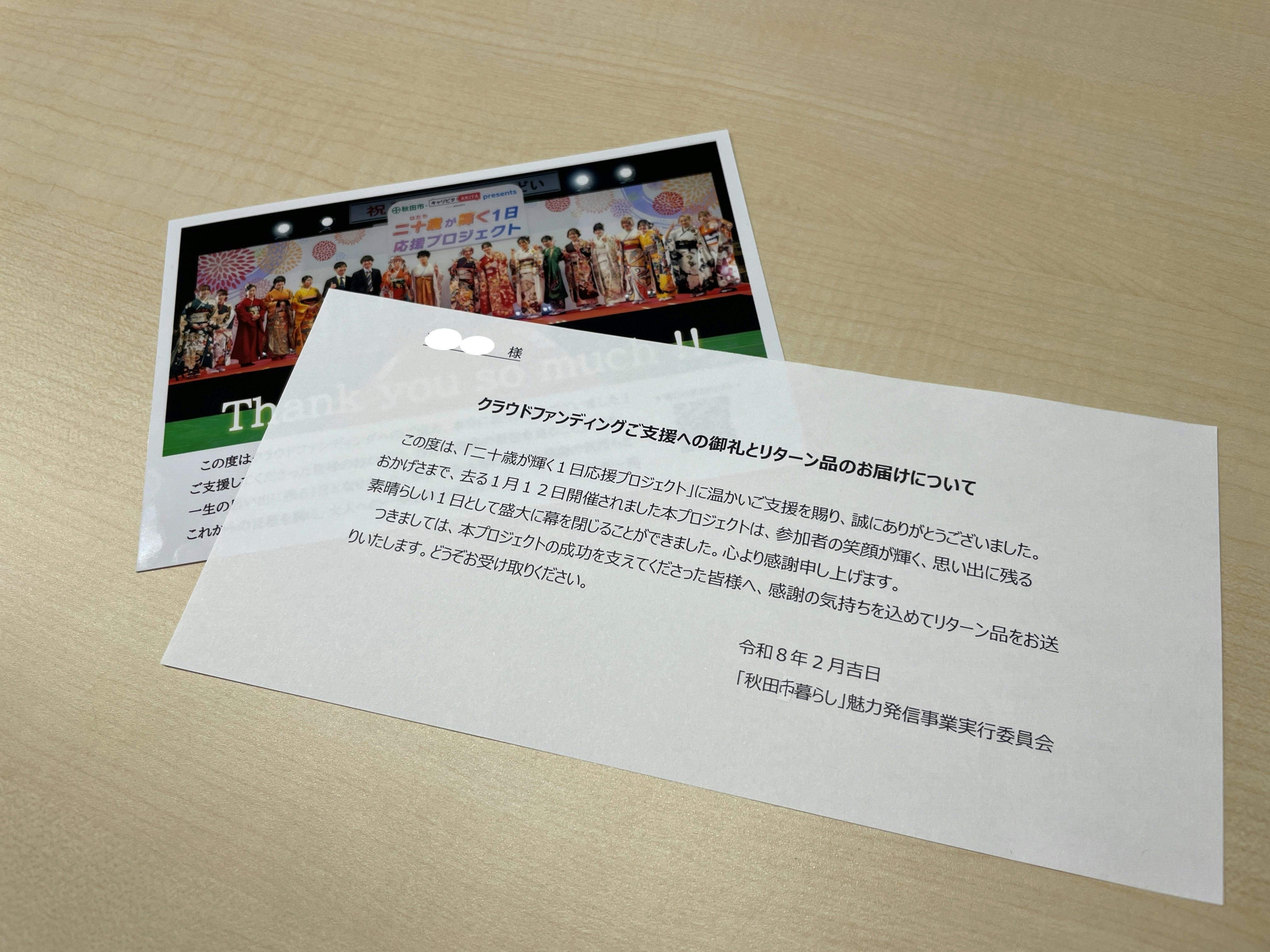2026/02/03 16:23「秋田市暮らし」魅力発信事業実行委員会のクラウドファンディング「二十歳が輝く1日応援プロジェクト」へご支援くださった皆様へ向けて、「お礼のメッセージカード」をお送りする準備が整いました。数日内にお手元に届く予定です。 この度はご支援をいただきありがとうございました! もっと見る