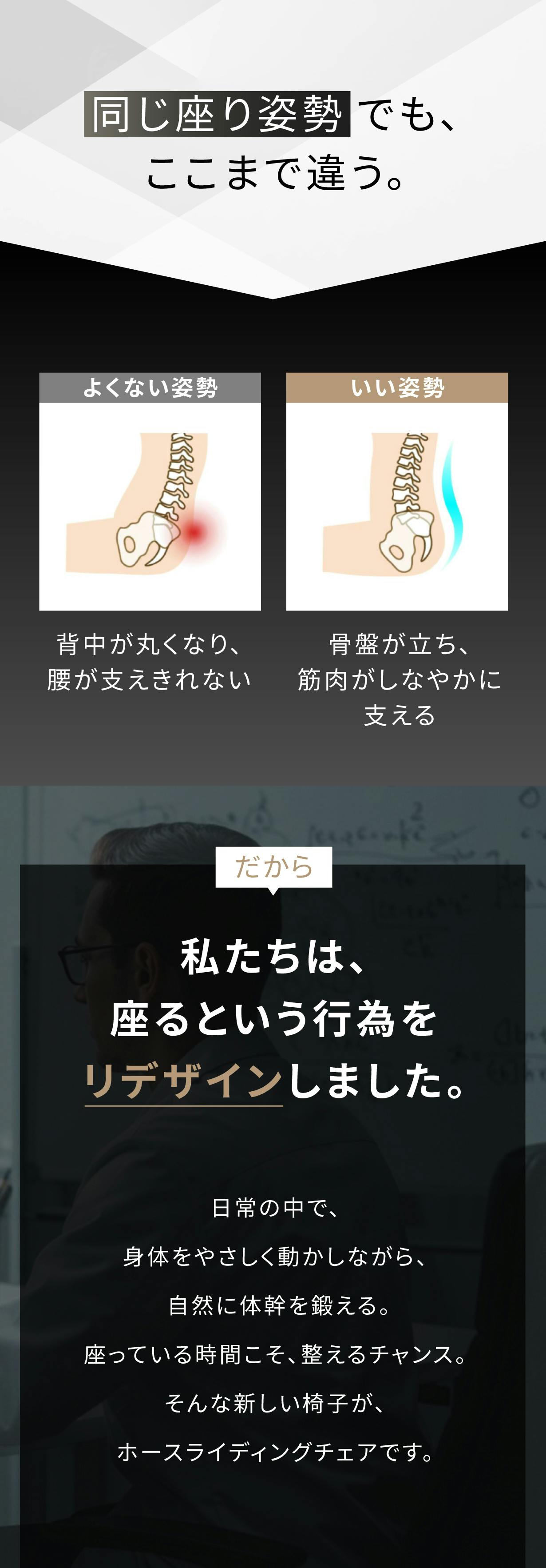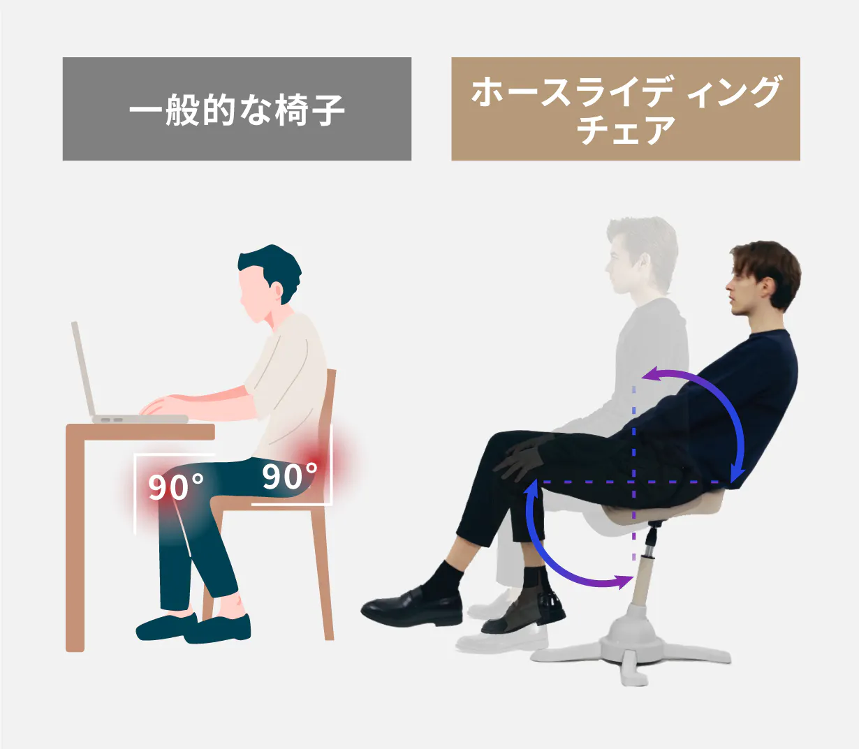 A2.座りっぱなしがつらくなってくる原因は足腰を90度に固定される状態を強いられているから。ホースライディングチェアはゆらゆらすることで自然と背骨のS字カーブをキープしながら、骨盤が立たたせた状態「良い姿勢」へ導きます。