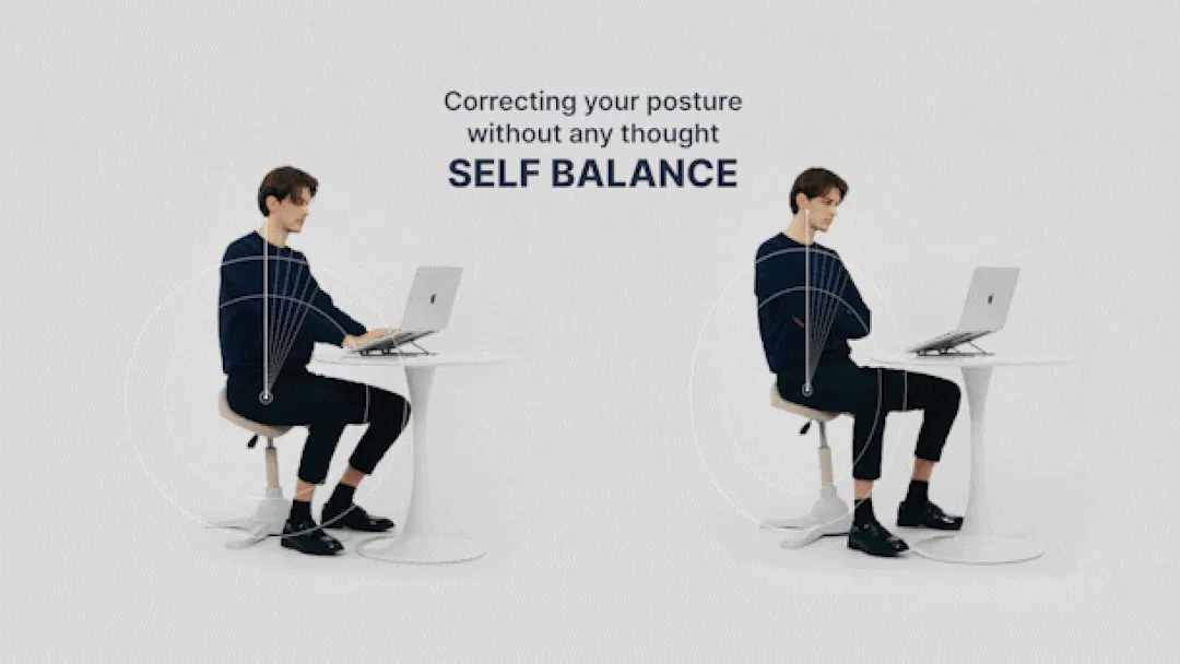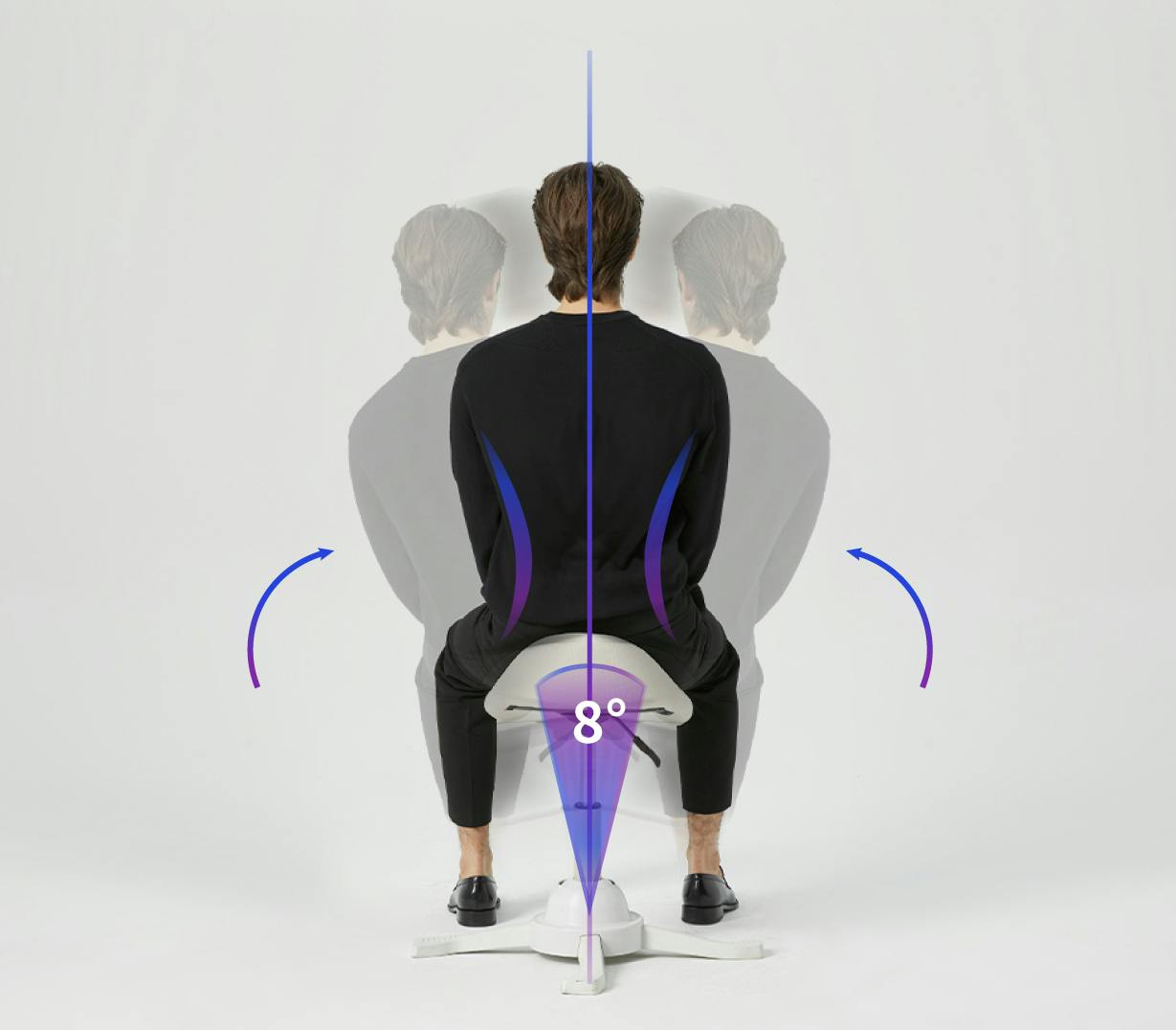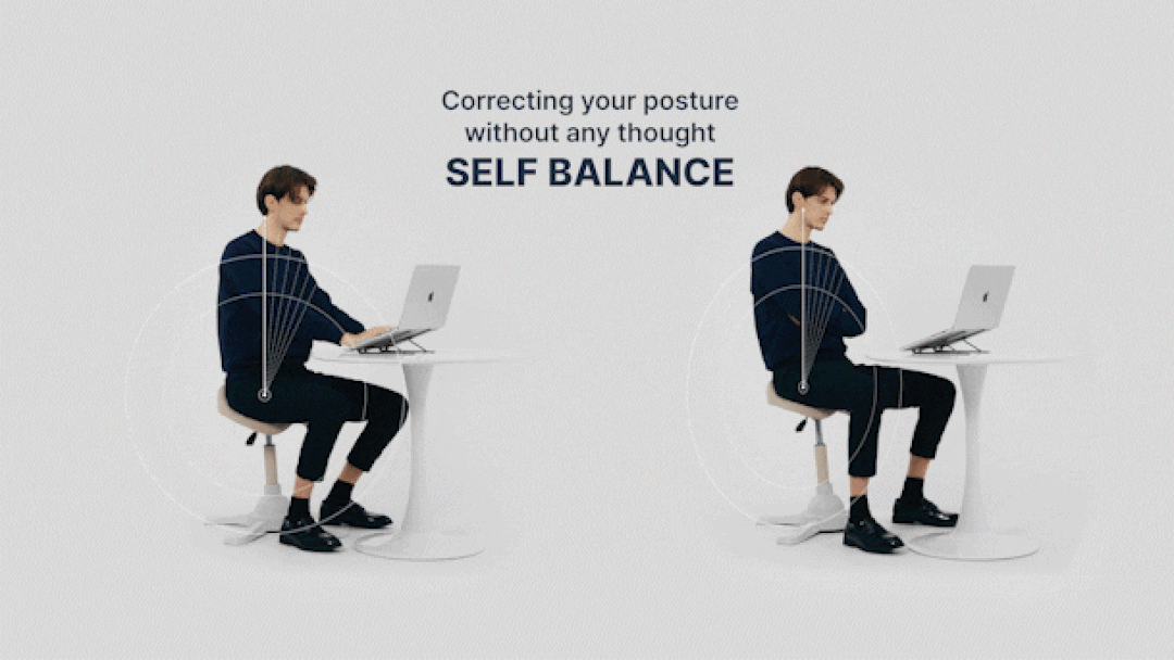 A3.それはセルフバランスメカニズム。韓国、アメリカ、ドイツで特許を取得しました。バランスボールのように座ってゆらゆらすることでお腹に自然と力が入るのでデスクワーク中でも体幹トレーニング。従来のバランスチェアとは違い、カクカクせず、ゆるやかでスムーズな揺れを作り出します。
