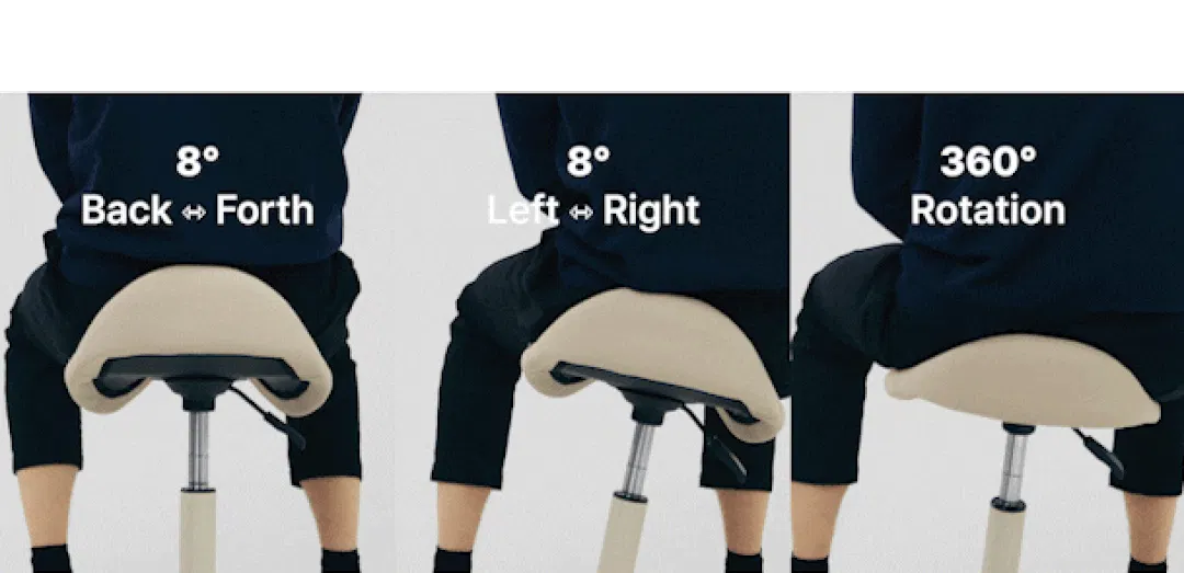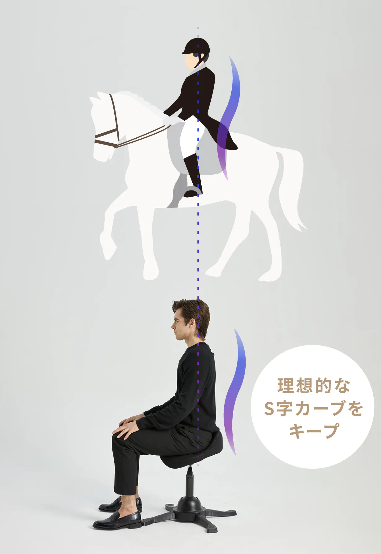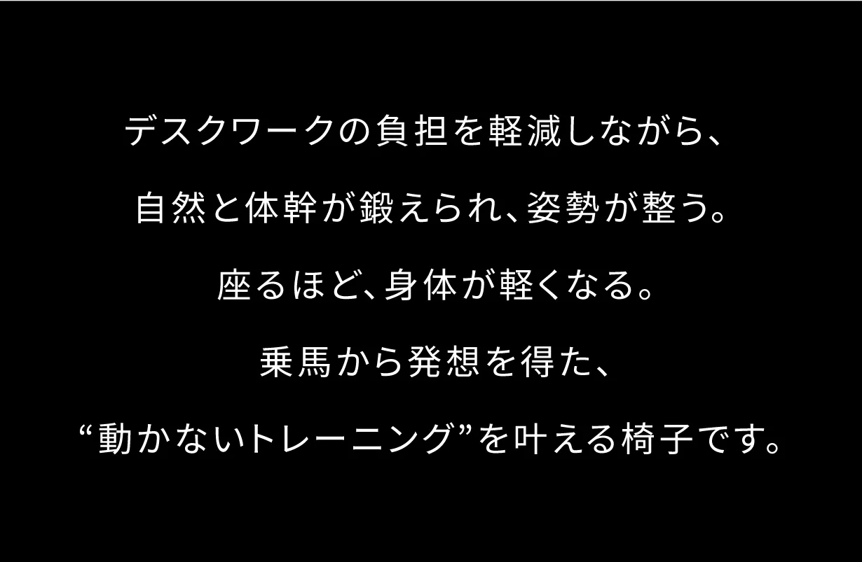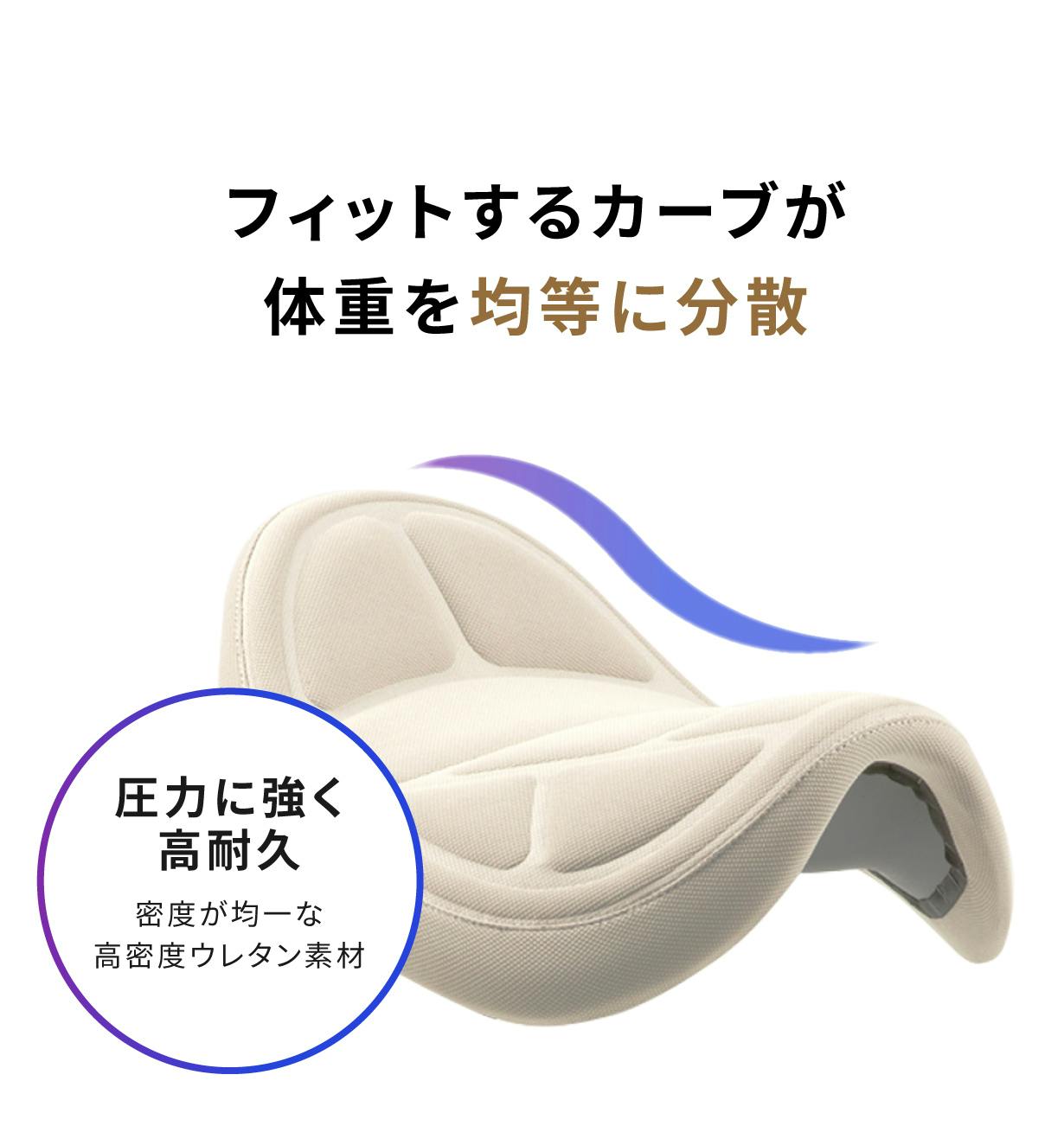 乗馬スタイルをとることで、腰を自然に支え、背骨の理想的なS字カーブをキープ。身体への負担を軽減し、座るだけで無理せず良い姿勢をサポートします。