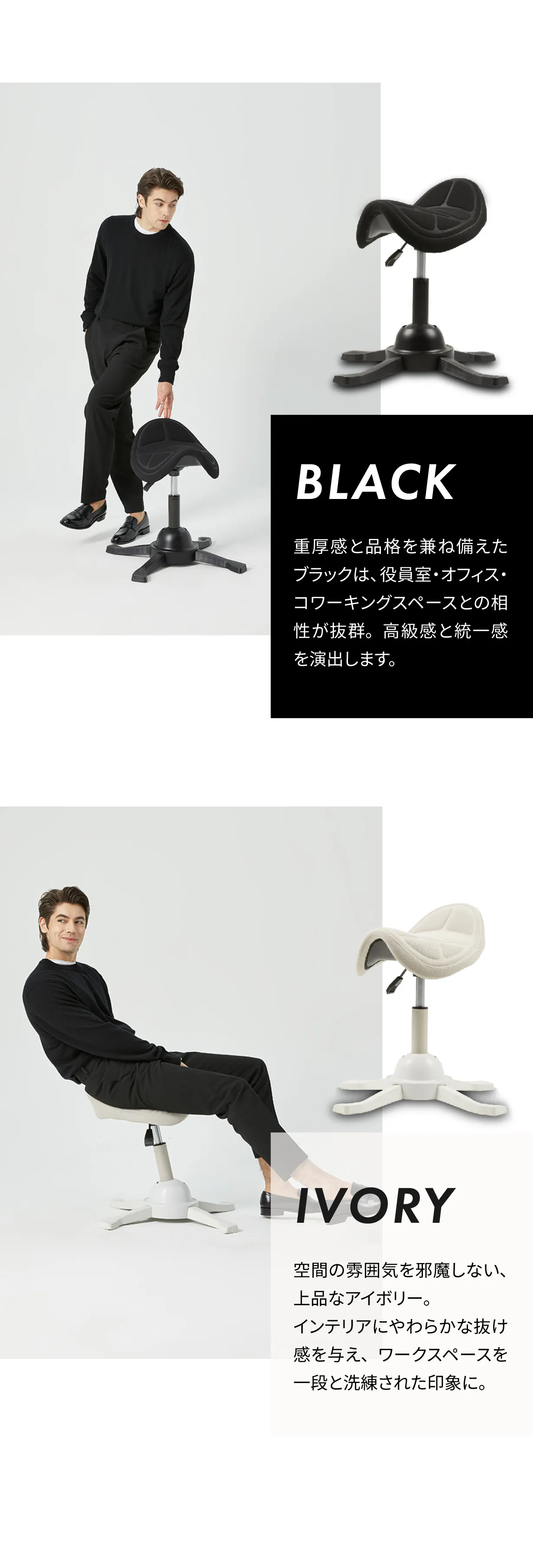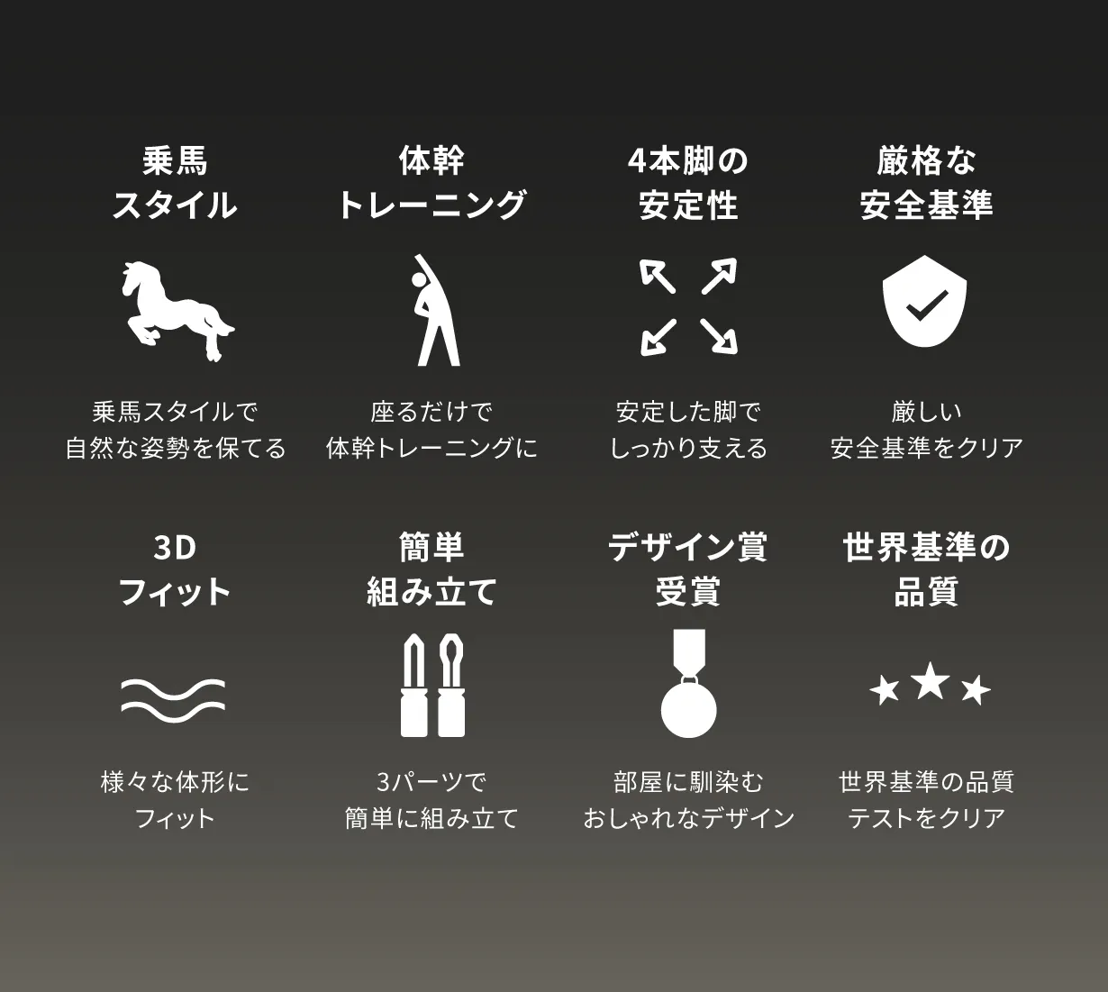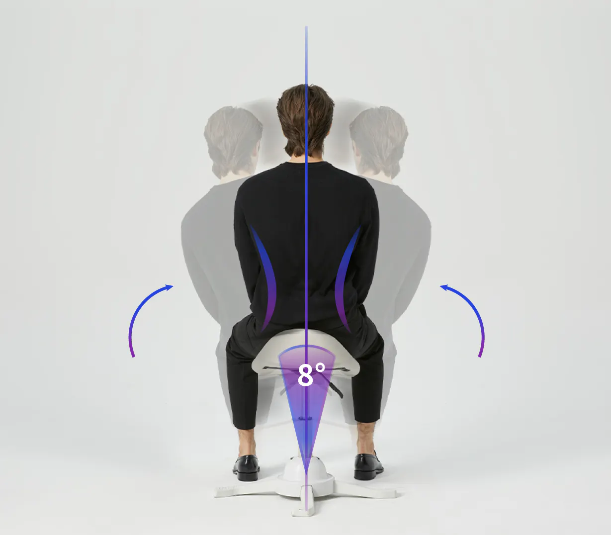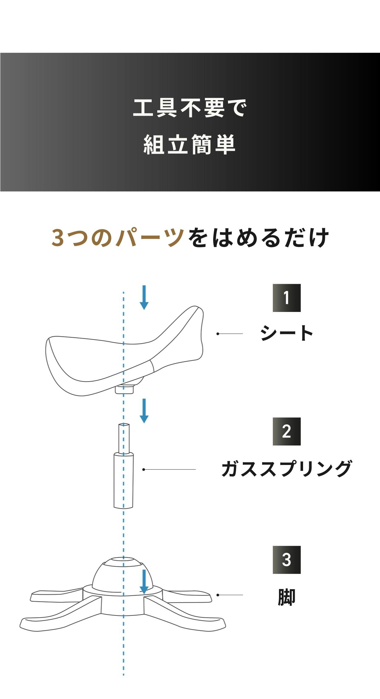 乗馬スタイルをとることで、腰を自然に支え、背骨の理想的なS字カーブをキープ。身体への負担を軽減し、座るだけで無理せず良い姿勢をサポートします。