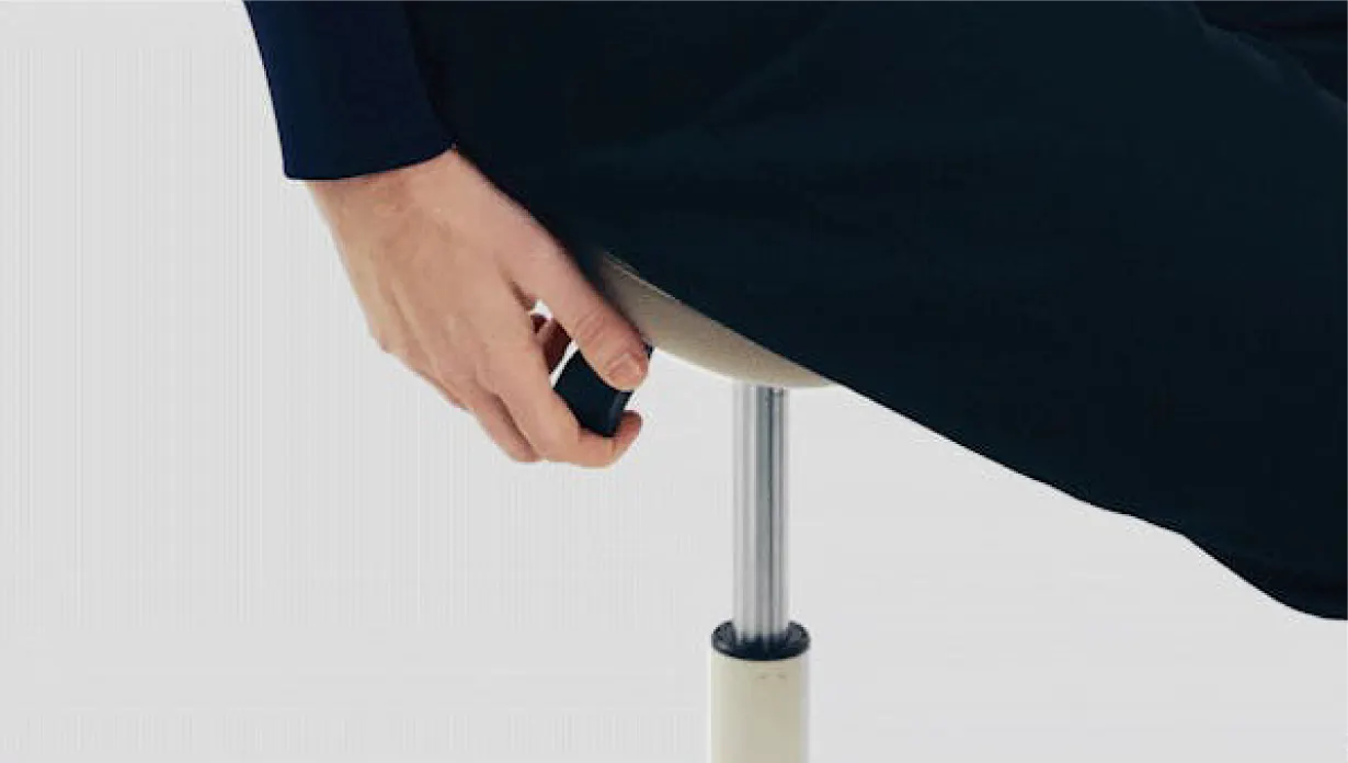 A7.チェアの調整はとても簡単です。シート下のレバーで高さの調整を行います。座ったままレバーを上に押し上げ高さを調整してください。元の高さに戻したい場合は、椅子から降りてレバーを押して引き上げてください。安全のため両足がかかとの床につく高さを推奨しております。