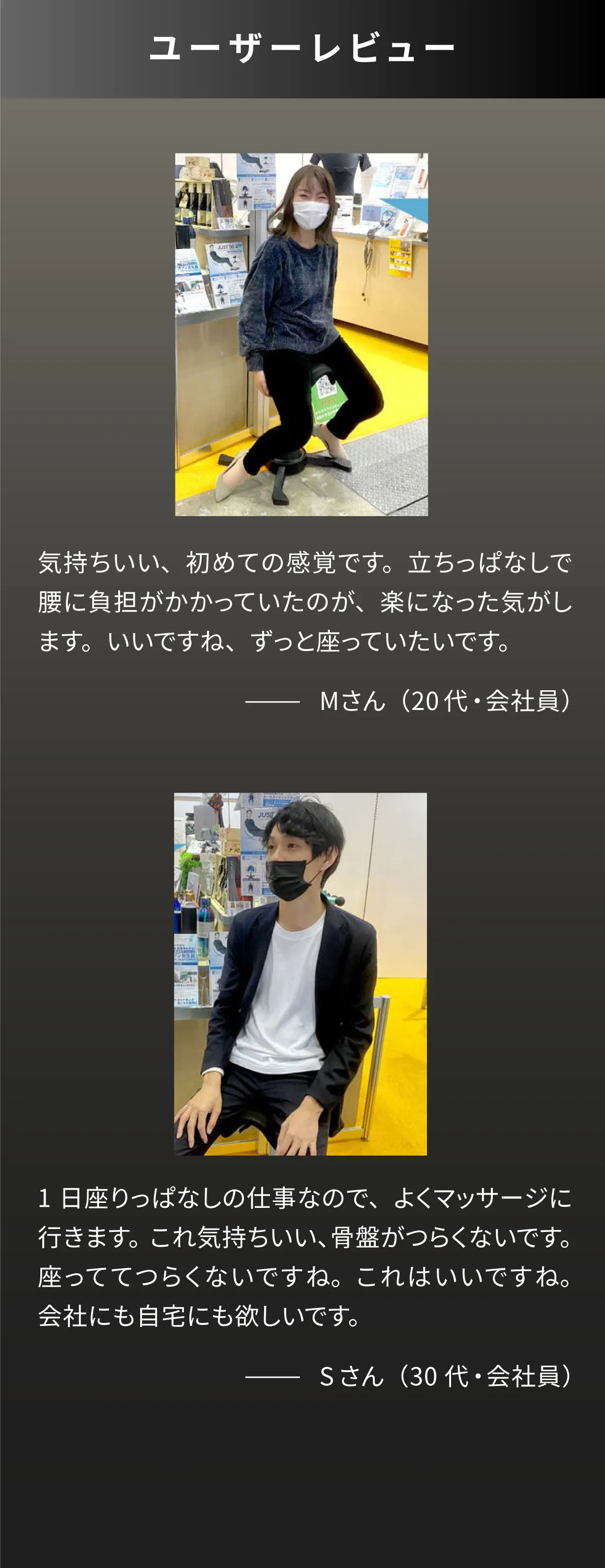 座った瞬間の気持ち良さと、心地良い揺れのクセになる座り心地をを少しでも多くの人に体感いただければ幸いです。