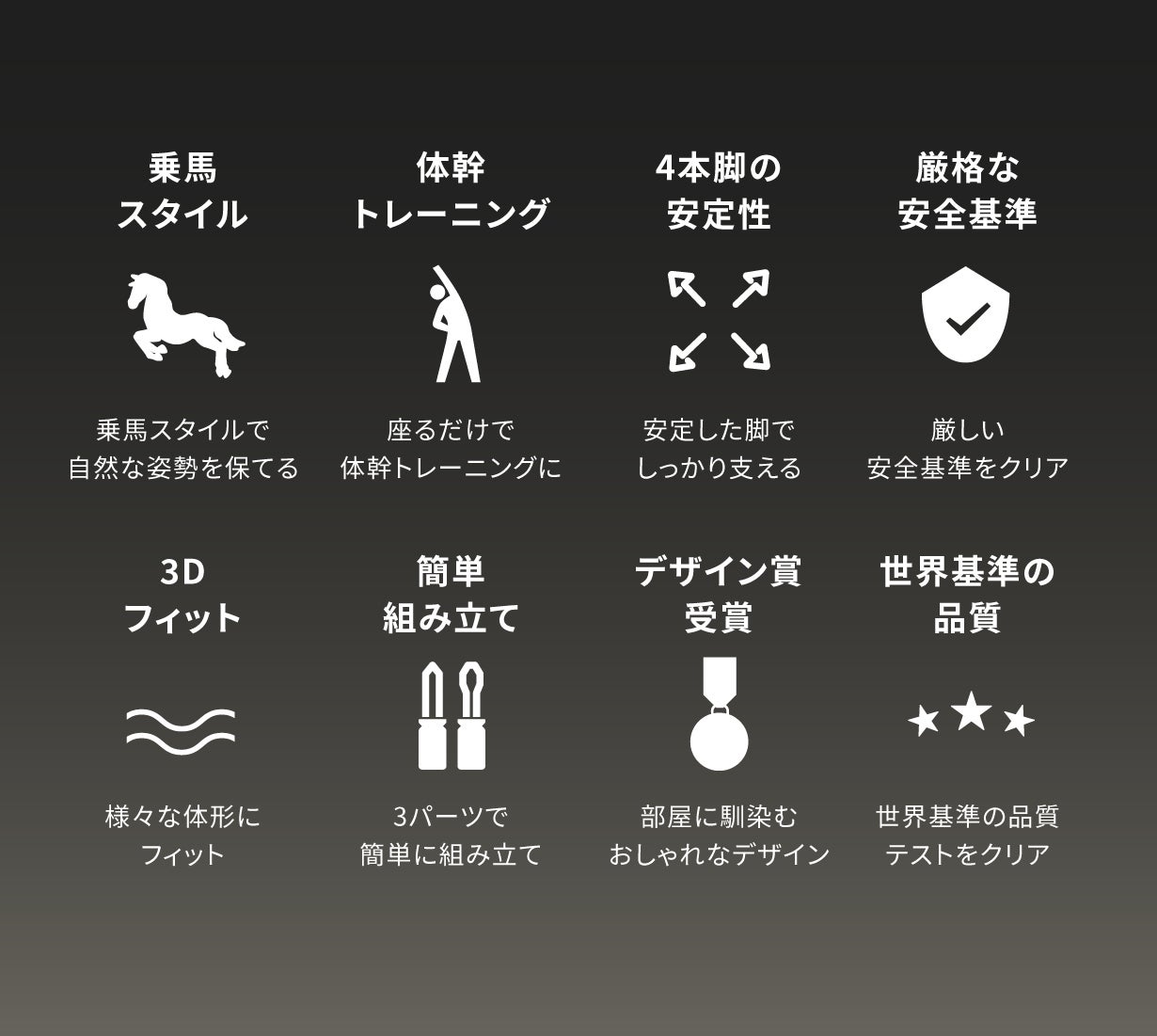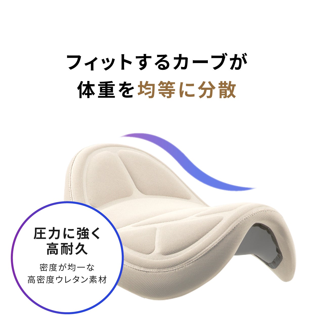 乗馬スタイルをとることで、腰を自然に支え、背骨の理想的なS字カーブをキープ。身体への負担を軽減し、座るだけで無理せず良い姿勢をサポートします。