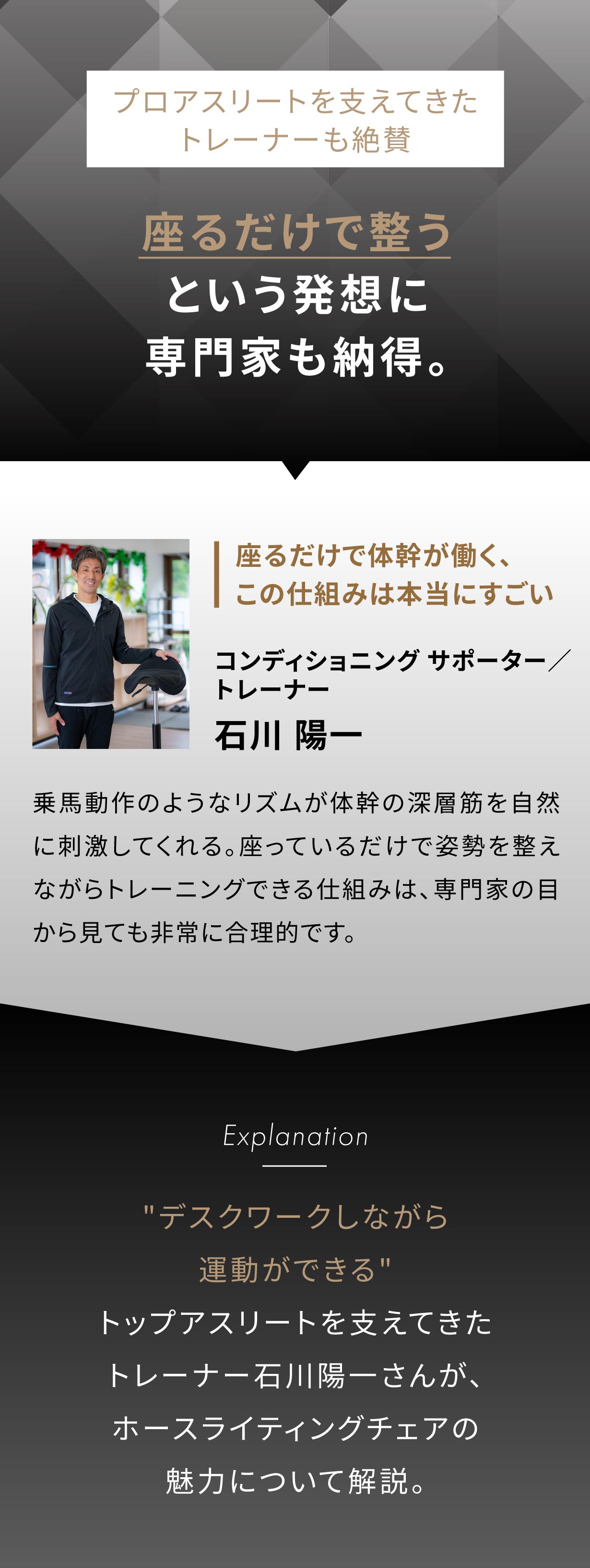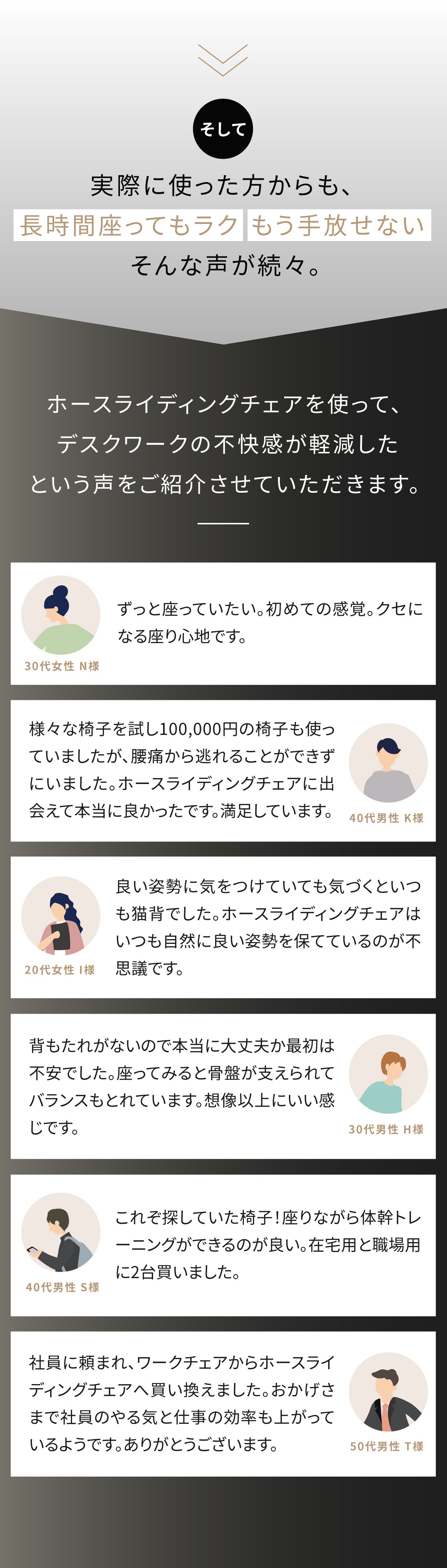 A2.座りっぱなしがつらくなってくる原因は足腰を90度に固定される状態を強いられているから。ホースライディングチェアはゆらゆらすることで自然と背骨のS字カーブをキープしながら、骨盤が立たたせた状態「良い姿勢」へ導きます。