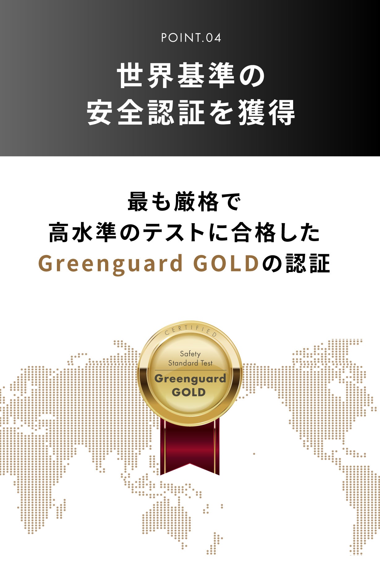 A5.米国のGreenguard GOLD の認証を取得。厳格な基準をクリアした製品のみに与えられる安全認証です。長く使いたいからこそ気になる安全性にも妥協せず、安定した品質を自信をもってお届けしています。