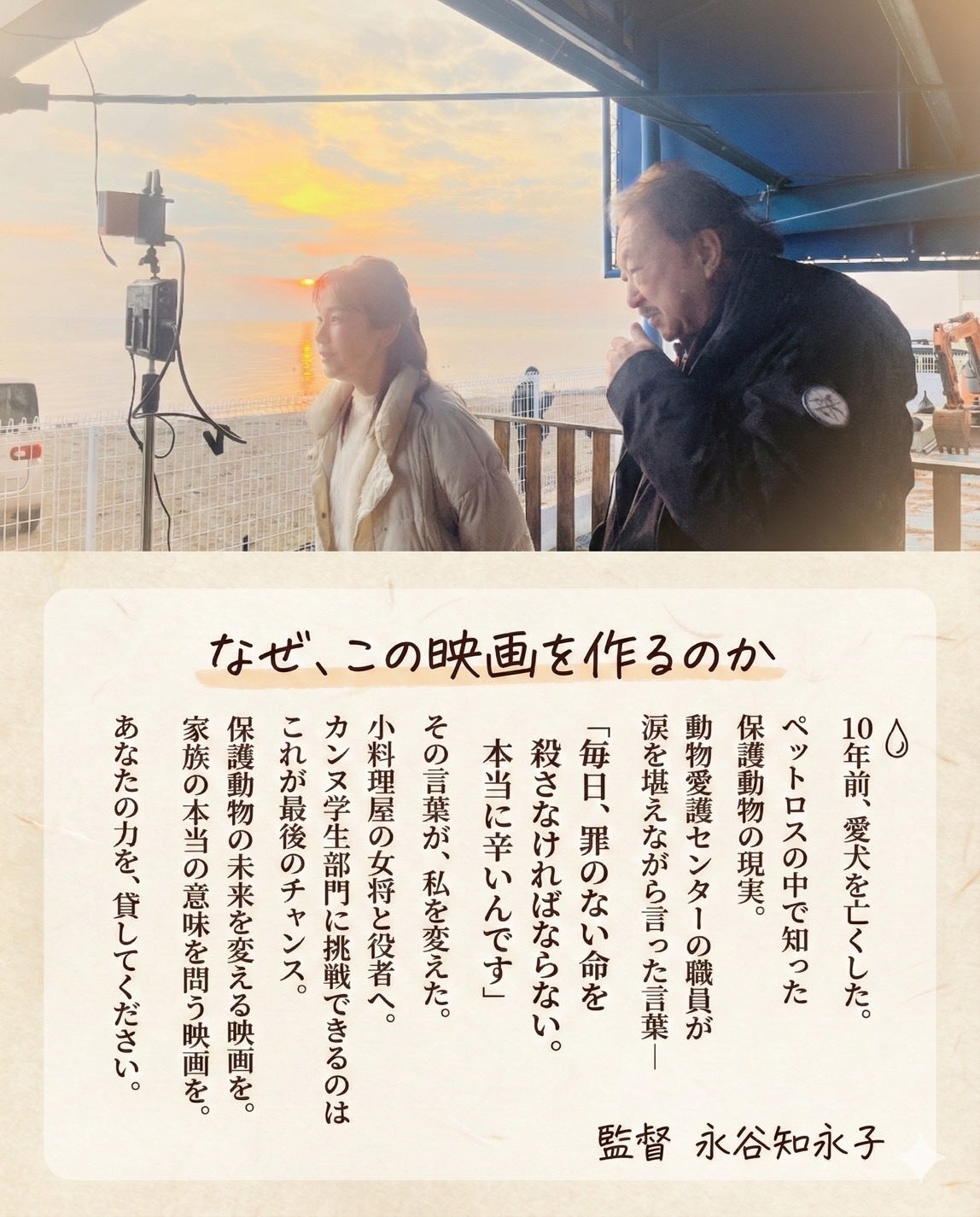 このたびは、永谷知永子(おかみちえこ)制作監督映画『湖の雫』にご支援いただきありがとうございます。すべて制作費、人件費、そしてこれから、各映画祭へのエントリー費、手数料等に当てさせていただきました。おかげさまで、無事編集まで終わりました。つきましては、関西関東それぞれで試写会を企画いたしましたので、皆様にお知らせし、ご招待したいと思います。“関西試写会”3月28日(土)滋賀県大津市“ピアザ淡海”305室(関西はスクリーンではなくプロジェクターになります。申し訳ございません。)18時30〜受付19時から上映をさせていただきます。(51分ほどの作品ご覧いただいた後、簡単な舞台挨拶をさせていただきます。)その後20時から20分ほど『さよならのその前に』を同時上映させていただきます。お時間ご都合、大丈夫な方はぜひお越し下さいませ。(なお会場までの交通費は自己負担になります。ご了承下さい。駐車場はございます。遠方の方はピアザ淡海、上の階はホテルになっております。)https://share.google/B4YfCQYg5DivjZN6fなお、今回は映画制作関係者とご支援(ご寄付)いただいた方のみとさせていただきます。どうしても+ α人数で参加ご希望の場合は直接永谷(tell 09021990377 アドレス hanasabi.meak@gmail.com)までご連絡くださいませ)“関東試写会”4月3日(金)月島にある映像スタジオにて。月島1-14-7(東京メトロ、有楽町都営地下鉄大江戸線月島より徒歩5分 下にサイトを添付)17時45分より受付18時より「さよならのその前に」(おかみ作品第1作目 20分)を上映後、「湖の雫」(51分)を18時20分過ぎをめどに続けて上映いたします。19時10分ごろから簡単な舞台挨拶をし、皆様をお見送りして19時半終了とさせていただきます。https://www.broadmedia.co.jp/studio/screening-room/前作「さよならのその前に」見逃した方も今回関西関東両方ご覧いただけますので、よろしければぜひお越しくださいませ。なお、関東も今回は映画制作関係者及びご支援いただいた方々(ご寄付)のみとさせていただきます。+ αで人数をご希望なさる方は、直接おかみ(上記の電話番号とアドレス)までご連絡くださいませ。*会場が関西約70席、関東50席ほどの場所となります。できましたら、事前にご参加の有無、お知らせいただけると助かります。よろしくお願いいたします。なお、関東では6月の中旬に新宿K'sシネマにてENBU学生作品上映が行われますが、こちらもご参加可能なのですが、ご自身でネット予約(3日前から受付)をしていただき、料金も発生して参ります。今回の試写会は無料ですので、ぜひこの機会にお越し下さいませ。見逃した方は新宿K'sシネマまでお足をお運びいただけるとありがたく存じます。また、今年1年、各映画祭にエントリー後、関係者及びご支援いただいた皆様にはYouTube限定のURLをお送りさせていただきます。見逃した方も来年にはそちらでご覧いただけます。また来年以降、機会があれば、関東関西で小さな映画館かと思いますが上映したいとも思っておりますので、その時はぜひお誘い合わせの上映館にお越しいただけるとうれしく思います。また今後も第3作目を考えております。その際はまたぜひ、皆様のご支援、ご協力、お力をお貸し添え下さいますよう、何卒、よろしくお願いいたします。敬具