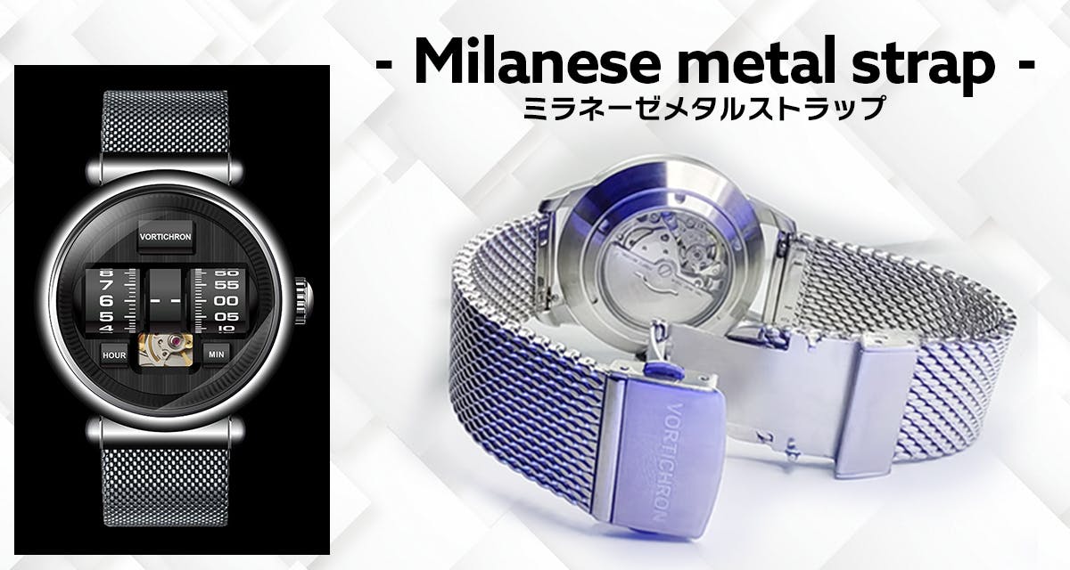 オプションでおしゃれなミラネーゼメタルストラップもご用意しておりますので、ご希望の方は別途お申し込みください。
