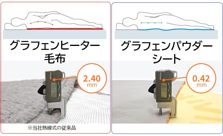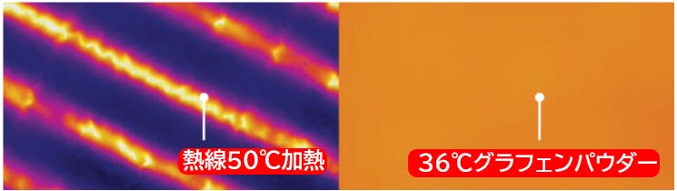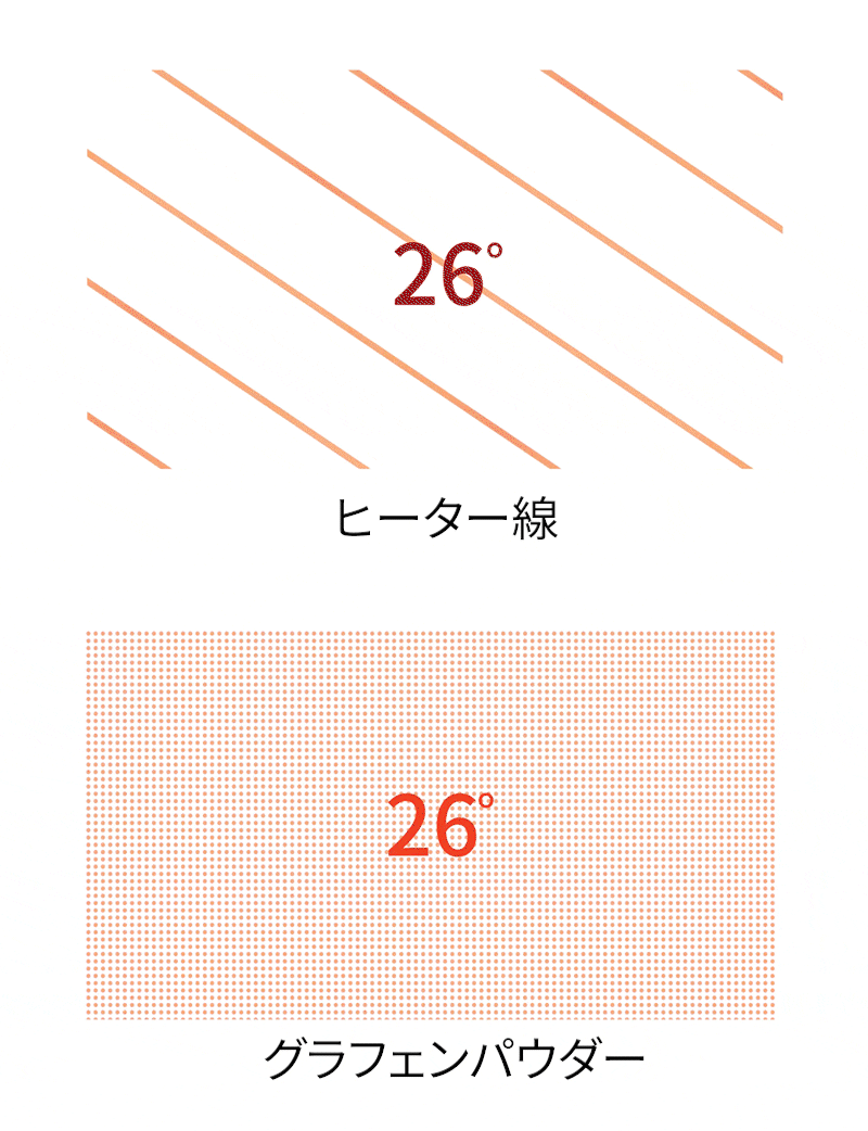 熱線は部分的に加熱し温めるが、グラフェンパウダーは面で温めるので温度が低くても十分暖かい