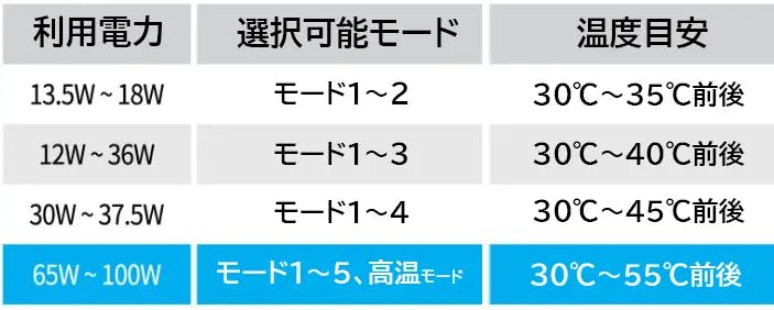 ※ モバイルバッテリー利用時のモードは、モバイルバッテリーの最大出力によって制限されます。