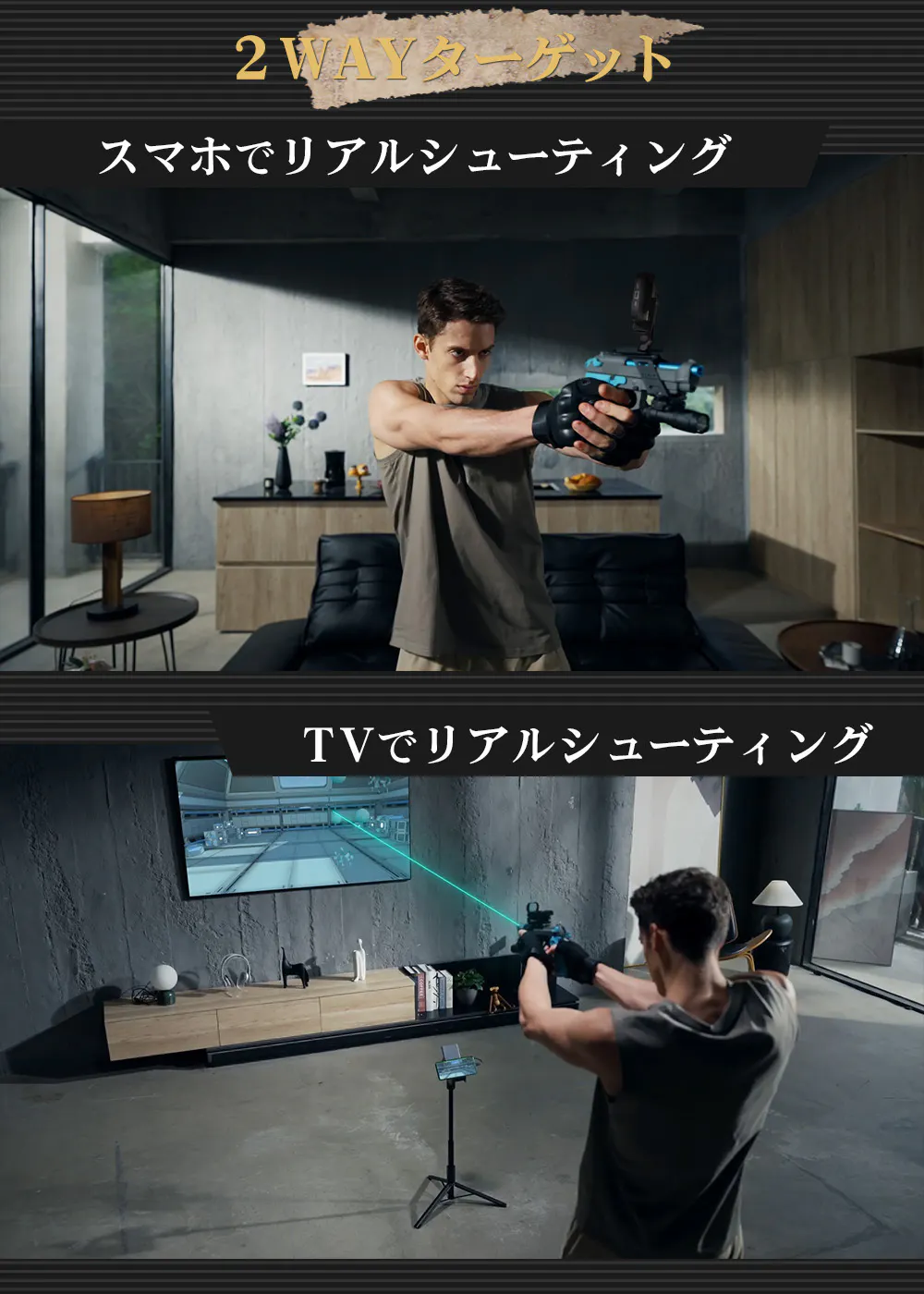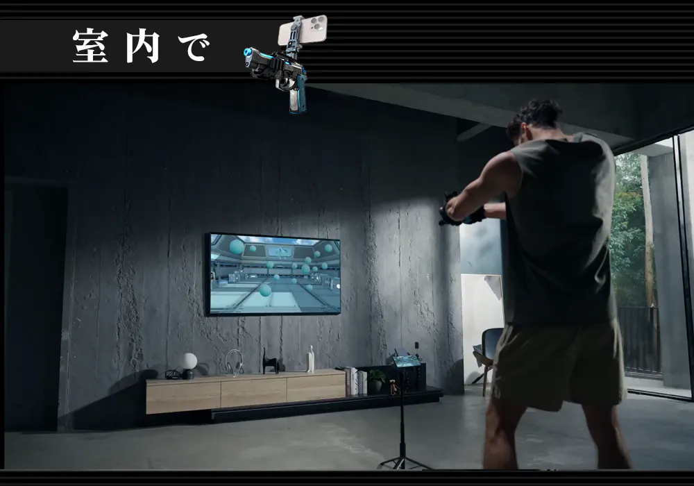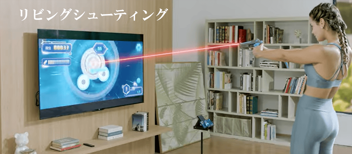TVやプロジェクターなどにアプリ画面をミラーリングし、銃口から放たれる赤外線ので着弾を認識します。