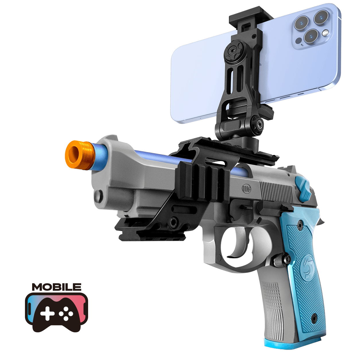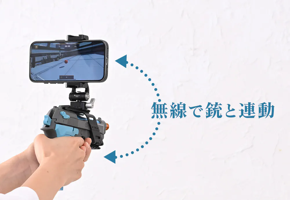 専用スマホホルダーを銃にセットして銃とスマホアプリを連動させます。