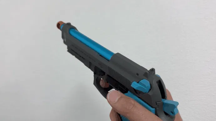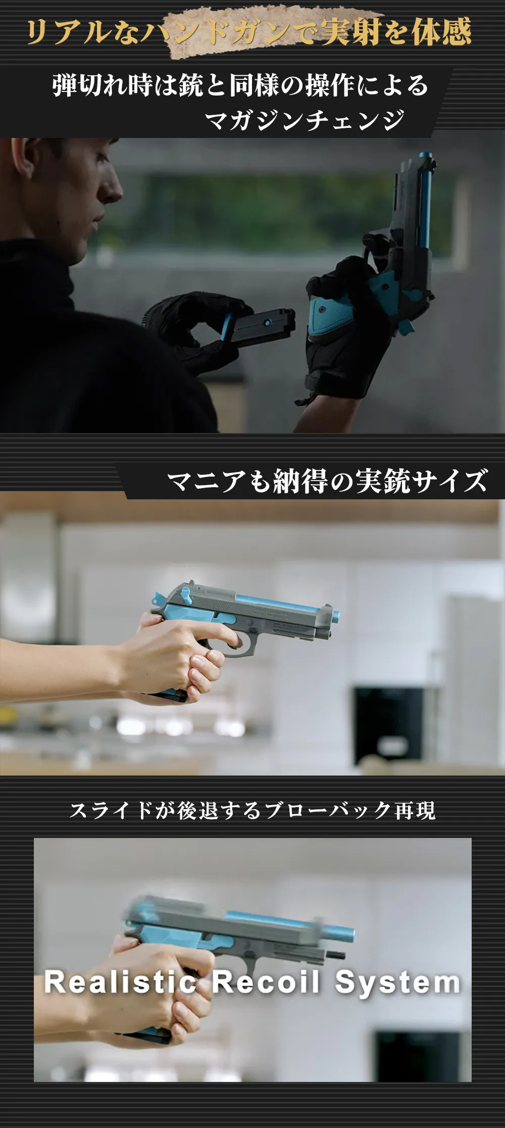 実在するハンドガンをモチーフに同様のサイズで再現したシューティングガン各国で販売する規制の都合でカラーリングは異なりますが、ゲームに関係のないパーツまでしっかり再現しています。