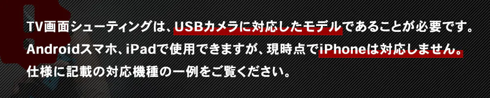 スマホシューティングはiPhone、Androidスマホに対応。TVシューティングはAndroidスマホ、iPadのみになります。また、無線ミラーリングが必要になります。ミラーリングのアダプターは付属しません。