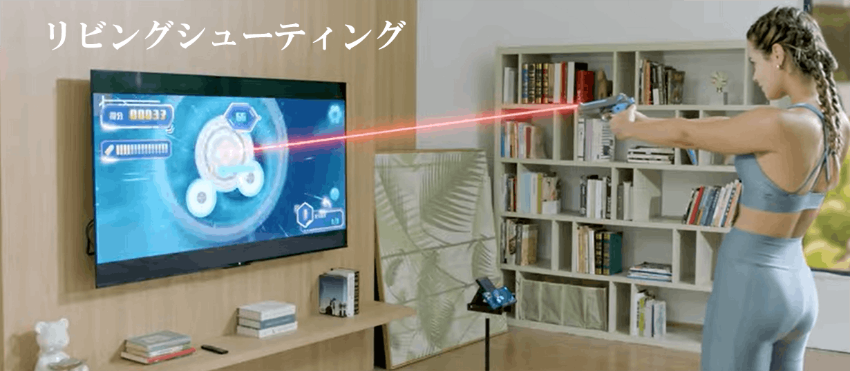 TVやプロジェクターなどにアプリ画面をミラーリングし、銃口から放たれる赤外線ので着弾を認識します。