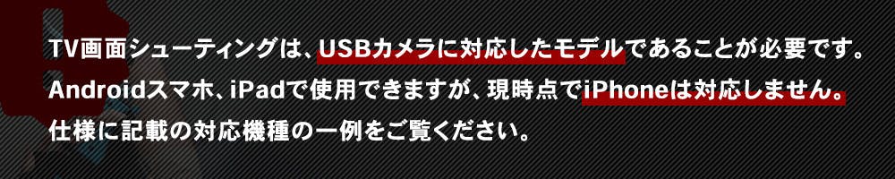 スマホシューティングはiPhone、Androidスマホに対応。TVシューティングはAndroidスマホ、iPadのみになります。また、無線ミラーリングが必要になります。ミラーリングのアダプターは付属しません。