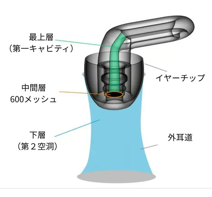 第1キャビティ(上層)はヘルムホルツ共鳴によって高周波を減衰し、
