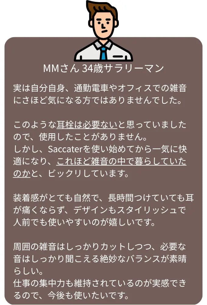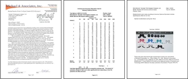 ※Saccater Moment Earplugsは米国規格協会の規格に基づき、マイケル&アソシエイツ株式会社でのテストをし実証されています。