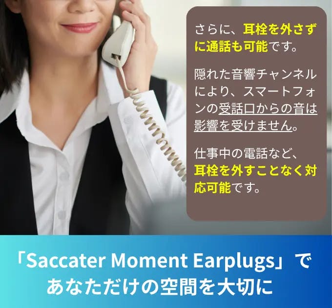 さらに、工事現場など騒音が飛び交う環境でも、Saccater Moment Earplug があれば相手の声はクリアに届き、同時に耳をしっかりと機械音などの騒音から守ってくれます。