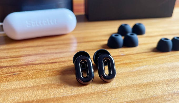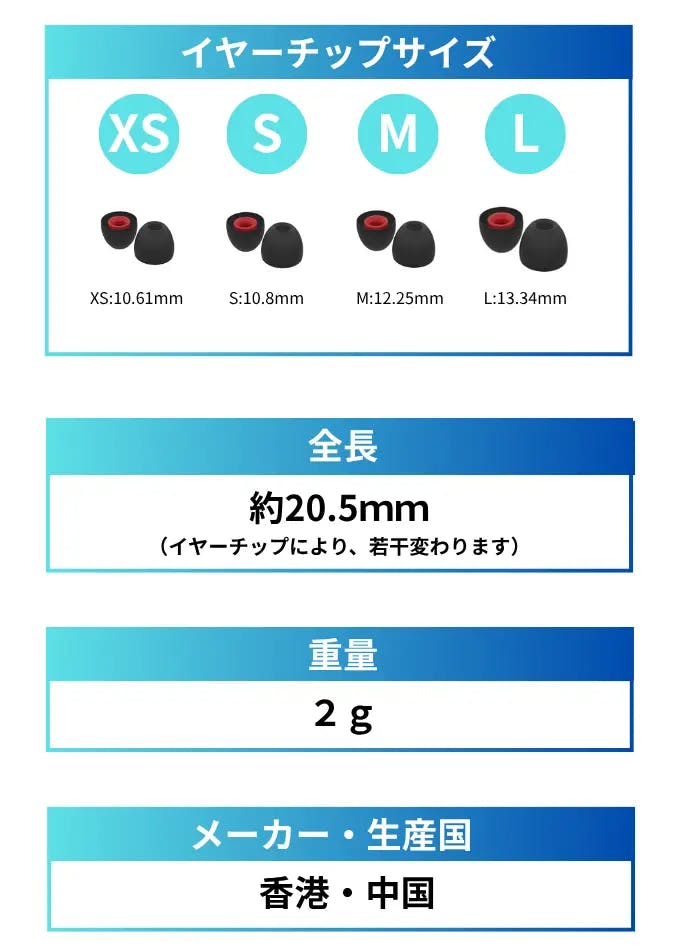 A4:柔らかく軽量な素材と、人間工学に基づいた設計により、長時間の使用でも圧迫感を感じにくい構造です。4サイズのイヤーチップも同梱しており、自分に合ったフィット感を選べます。