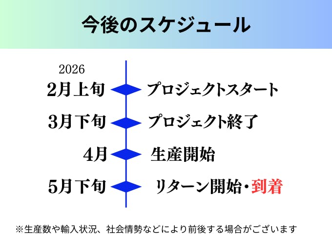 ※本文中に記載させていただいたスケジュールは、あくまでプロジェクト公開時点の予定です。支援購入の性質上、配送遅延のおそれがございます。