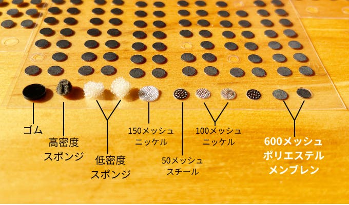 「Saccater Moment Earplugs」にたどり着くまでに、ゴムシート、密度の異なるスポンジ、様々な仕様の金属メッシュなど、様々な防音材をテストしました。