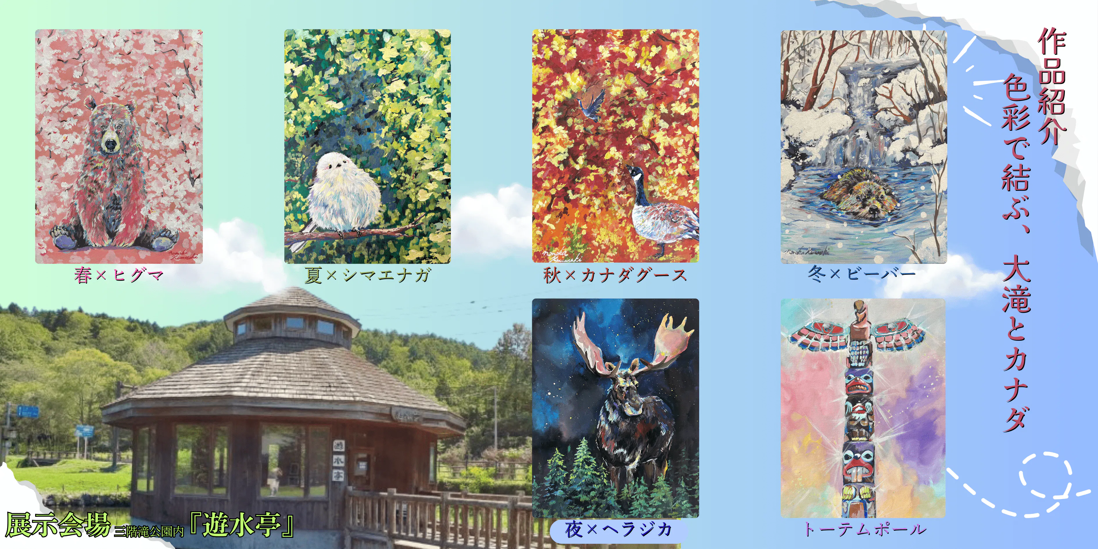 展示作品は大滝で展示した作品5点(ヒグマ、シマエナガ、カナダグース、ビーバー、カナダムース)を予定しています。