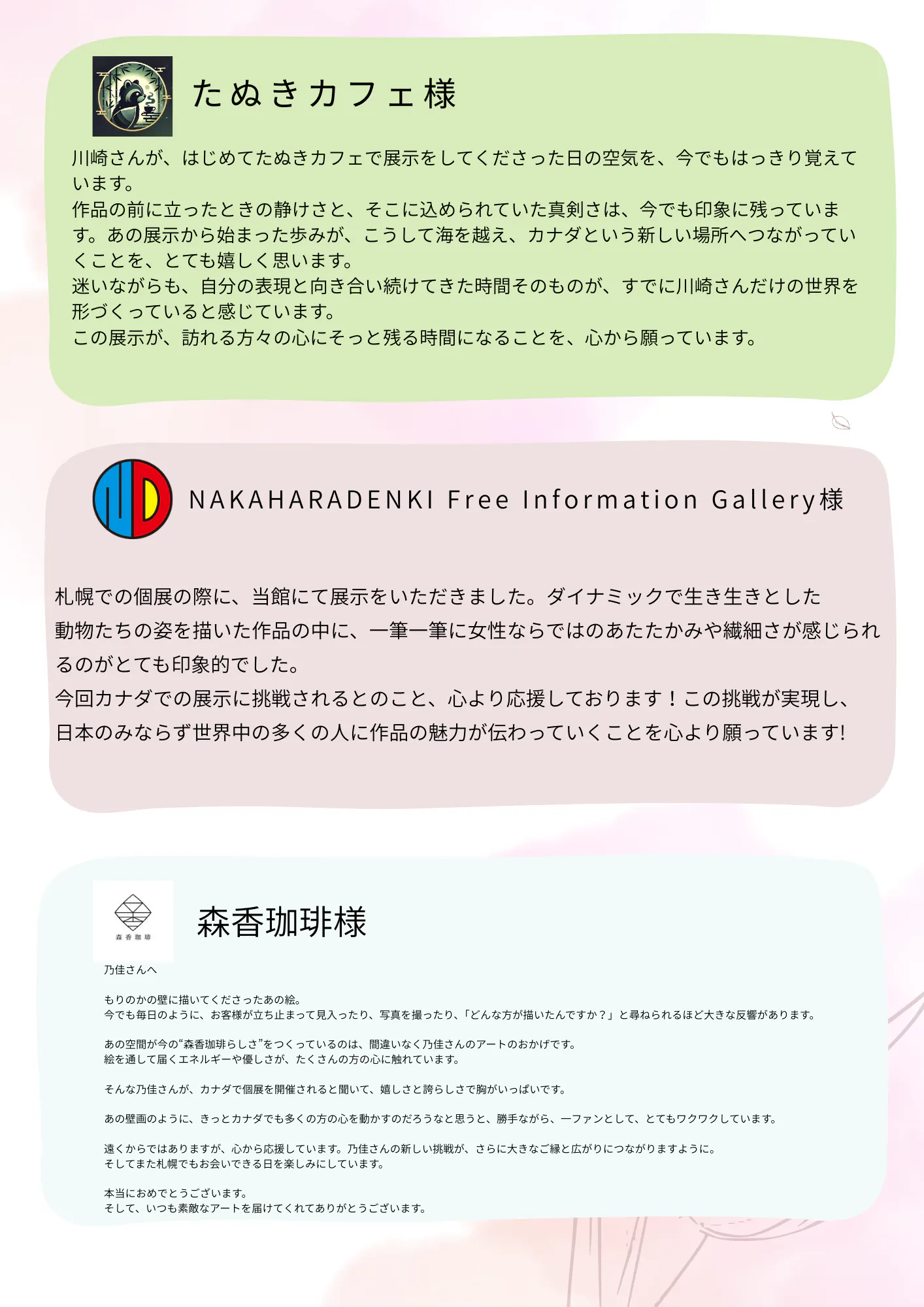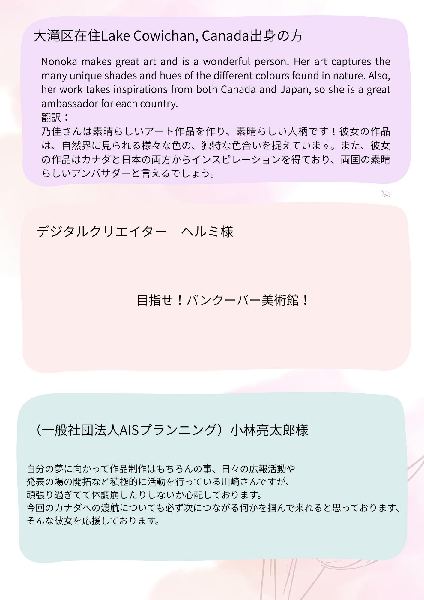 今回のカナダ展示挑戦に向けて、これまでに応援してくださった方々から、