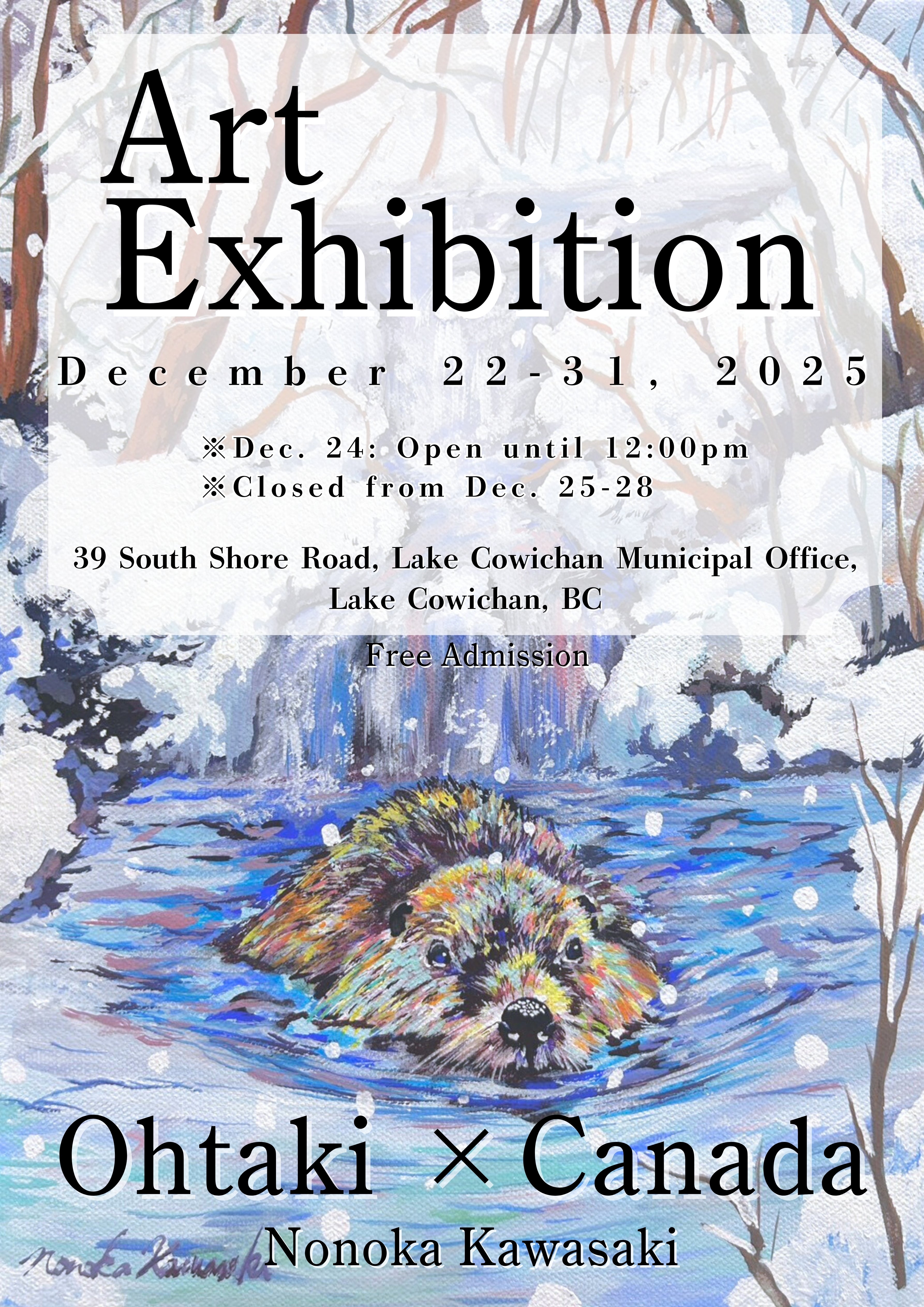 2025年12月22日~12月30日に、カナダ・レイクカウチン町で日本とカナダをつなぐ国際交流アート展を開催します。今年10月に北海道伊達市大滝区で行った『大滝×Canada国際交流アート展』では、150名以上の方にご来場いただきました。そのご縁をカナダにも広げるため、現地で展示を行います。
