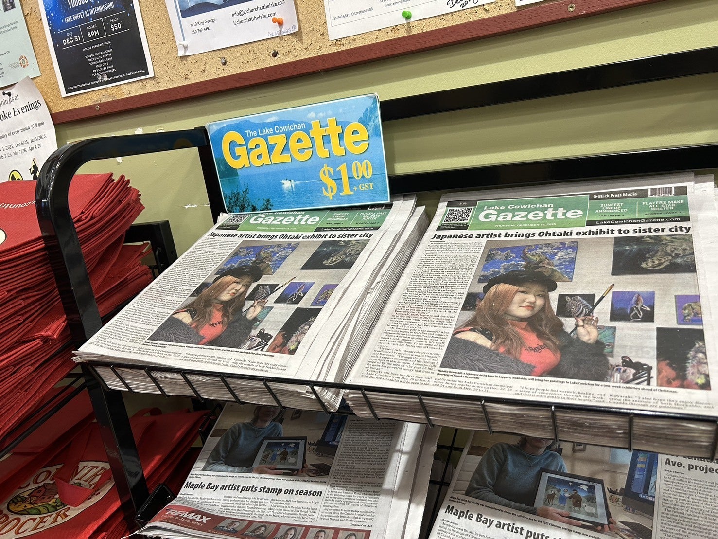 2025/12/29 07:53このたび、カナダ・ブリティッシュコロンビア州レイクカウチンの地元新聞「Lake Cowichan Gazette」の表紙面に、私の作品と活動を紹介していただきました!日本とカナダをつなぐアートプロジェクトとして、これまで取り組んできた制作や展示の様子を丁寧に取り上げていただき、大変光栄に思っています。現地の方々に作品を直接見ていただき、言葉を交わしながら交流できることは、私にとってかけがえのない経験となっています。このような機会をいただけたのも、日頃から応援してくださっている皆さまのおかげです。心より感謝申し上げます。これからも、国や文化を越えて想いを届けられる作品づくりを続けていきたいと思います!▼記事内容It has been said that painting is self-discovery; every good artist paints what they are. Nonoka Kawasaki, a Japanese artist who was born in Sapporo, Hokkaido will be bringing her paintings to the town of Lake Cowichan for a two week exhibition before Christmas. Kawasaki, who lived and studied in Vancouver for one year, held an international exchange exhibition in Ohtaki, Japan, this past October. It was through that project that she became connected with its sister city, the Town of Lake Cowichan. This will be her first time travelling to Lake Cowichan.“After holding my exhibition in Ohtaki, I began hoping to exhibit my work in Lake Cowichan as well,” said Kawasaki. “I reached out by email, and I was very happy when I received a reply from the Town of Lake Cowichan which was my first direct contact with the town. I am most looking forward to meeting the local people, seeing the natural landscape, and feeling the real atmosphere of the town. I hope to connect through art, and cultural exchange.” Kawasaki first had the self-discovery that she was an artist at heart and began drawing seriously in the fourth grade after her teacher praised her artwork. “At that time, I dreamed of becoming a background artist for Studio Ghibli,” said Kawasaki. “Later, I decided to pursue my dream of becoming a painter; my long-term goal is to one day exhibit my work at the Vancouver Art Gallery.”Kawasaki, really began to sink her brush in to her artwork in 2018, continuing to actively paint while working other jobs, but began working as a professional artist in May of this year. Her favourite medium to work with is acrylics. “My favourite part is the moment when a painting begins to feel alive and connects emotionally with someone,” said Kawasaki. When asked what inspires her work, Kawasaki said: animals, nature, life itself, and human emotions. To see some of her artwork visit her Instagram @kawasaki.nonoka.“My use of rich, vibrant colours is strongly influenced by my time living in Canada,” said Kawasaki. “Through the gaze of animals, I express emotions and the feelings I experience at that moment. I am especially inspired by the idea of ‘the gaze of life’, the quiet but powerful energy that lives in all beings.” Kawasaki will have her first time visit to Lake Cowichan from Dec. 20 to Jan. 5, 2026. Her free art exhibit will be open to the public inside the Lake Cowichan municipal office during regular hours on Dec. 22, 23 and 24 and from Dec. 29 to 31. “I hope people feel warmth, healing, and a sense of connection through my work, and that it stays gently in their hearts,” said Kawasaki. “I also hope they enjoy discovering the animals of both Hokkaido, and Canada through my paintings.”___▼記事日本語訳「絵を描くことは自己発見である」とよく言われるが、北海道札幌市出身のアーティスト、川崎乃佳さんにとって、それはまさにその通りだ。川崎さんはこのたび、カナダ・ブリティッシュコロンビア州レイクカウチンで、2週間にわたる作品展を開催する。川崎さんは以前、バンクーバーに住み学んでいた経験があり、今年の秋には日本の大滝町で国際交流展を開催した。この展示をきっかけに、姉妹都市であるレイクカウチンとのつながりが生まれた。「大滝での展示を終えた後、いつかレイクカウチンでも作品を展示したいと思うようになりました。町の方からお返事をいただいたときは本当に嬉しかったです。現地の人々と出会い、自然に触れ、実際の空気を感じられることをとても楽しみにしています。アートを通して交流できたら嬉しいです」と川崎さんは語る。川崎さんがアーティストとしての道を意識し始めたのは小学生の頃。教師に絵を褒められたことがきっかけだった。「当時はスタジオジブリの背景美術を描く仕事に憧れていました」と話す。その後、創作活動を続け、2018年から本格的に作家として活動を開始した。アクリル絵具を主な画材とし、「絵が命を持ち、誰かの心とつながる瞬間が一番好き」だという。動物や自然、人の感情をモチーフにしながら、「命のまなざし」をテーマに制作を続けている。川崎さんは12月20日から1月5日までレイクカウチンを訪れ、展示は12月22日・23日・24日、そして12月29日から31日まで、レイクカウチン市庁舎にて一般公開される予定だ。「作品を通して、あたたかさや癒しを感じてもらえたら嬉しいです。そして、北海道とカナダ、両方の動物たちの魅力を楽しんでもらえたらと思っています。」 もっと見る