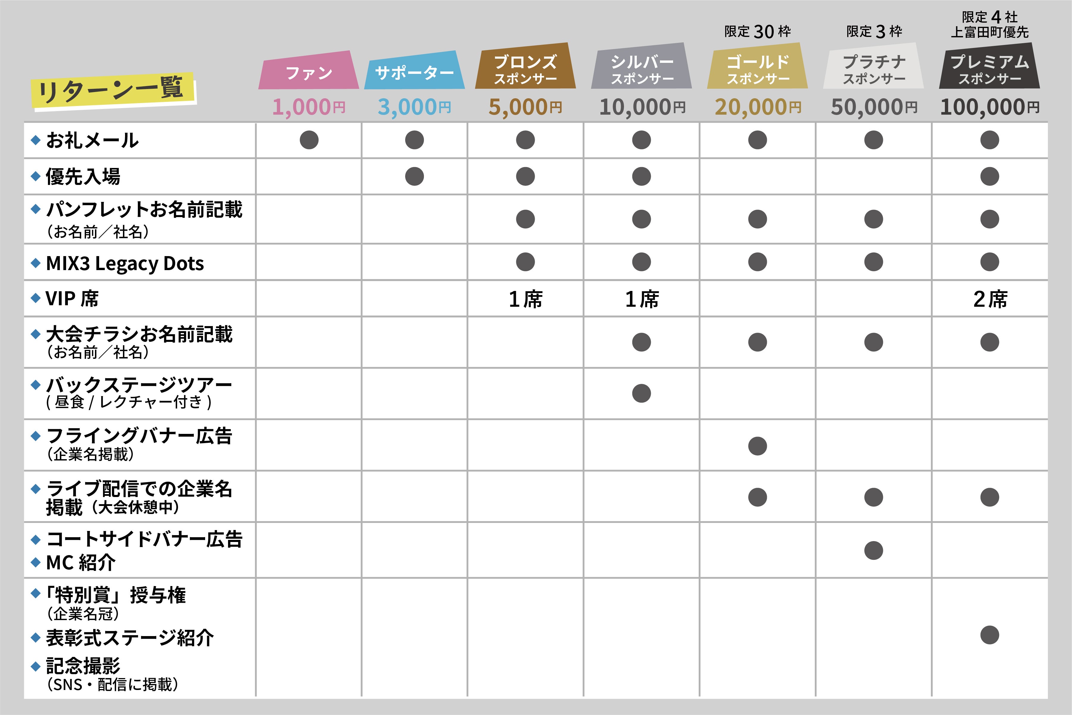 具体的には、写真撮影・記録制作費用(参加チームの記録、SNS・広報用素材)ライブ配信費用(遠方のファンや家族にも観てもらうため)広報宣伝費用(チラシ、SNS広告、webサイトの制作、地域向けアナウンスなど)などです。