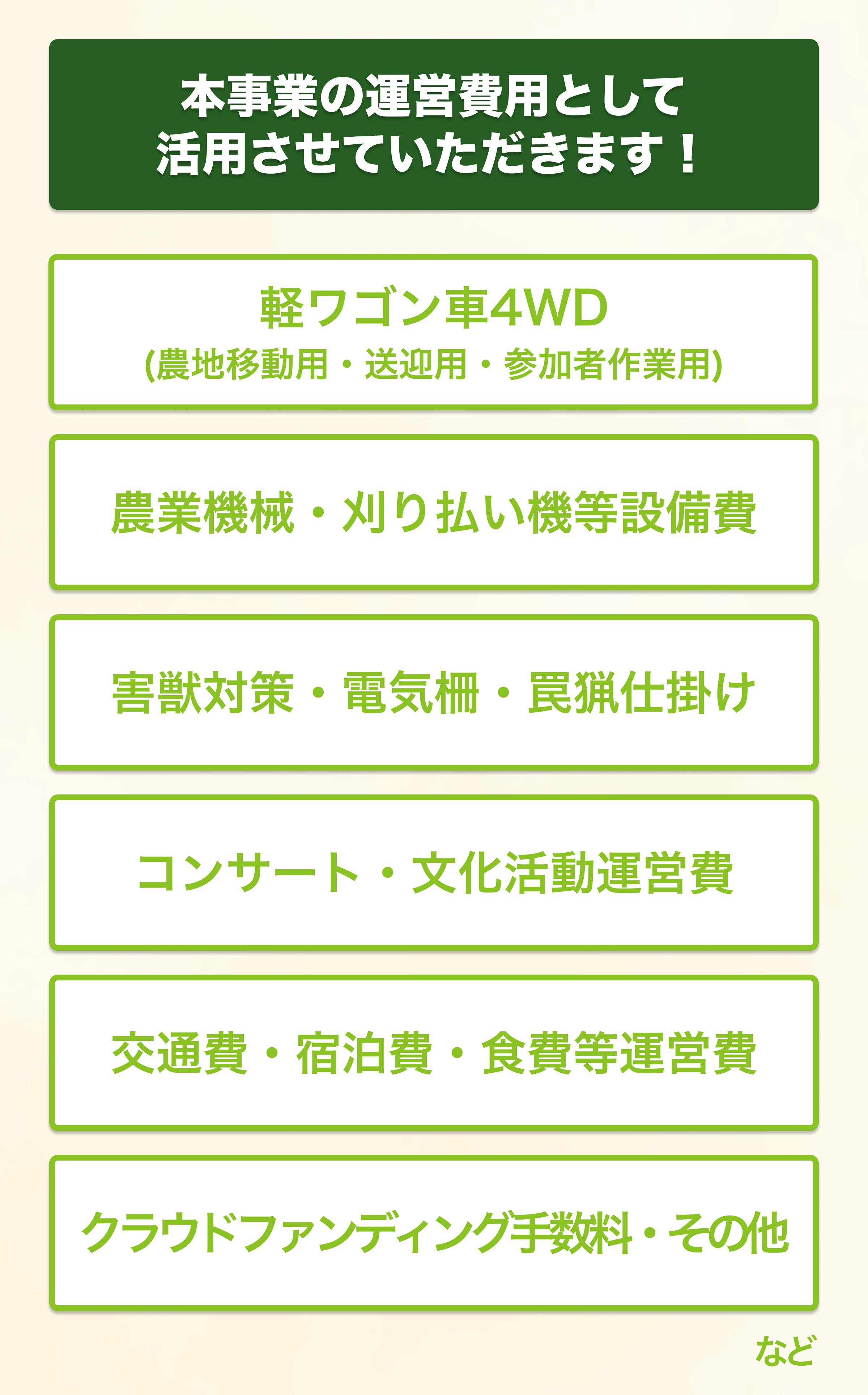 *集まった支援金額によって、最適な使い方をいたしますので、下記項目以外で使用させていただく可能性もございますこと、予めご理解のほどよろしくお願いいたします。