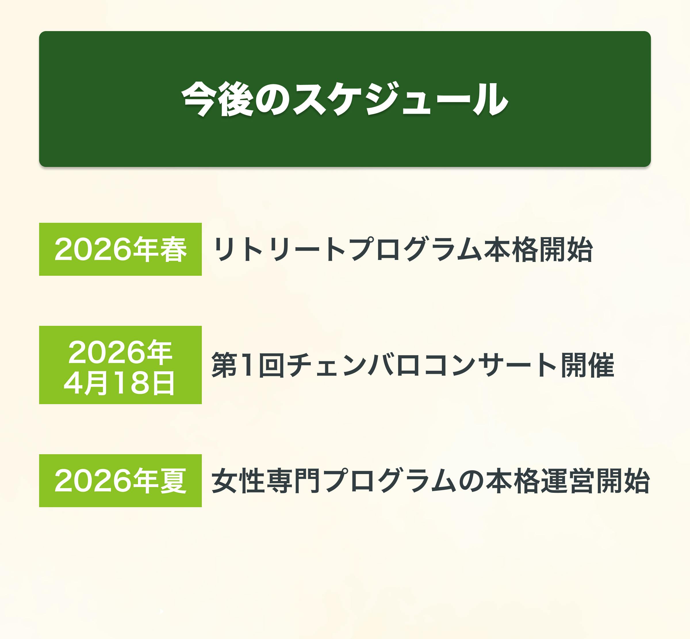 私たちのリトリート事業では、「本物の体験」として音楽・食・自然・健康を融合させたプログラムを提供いたします。